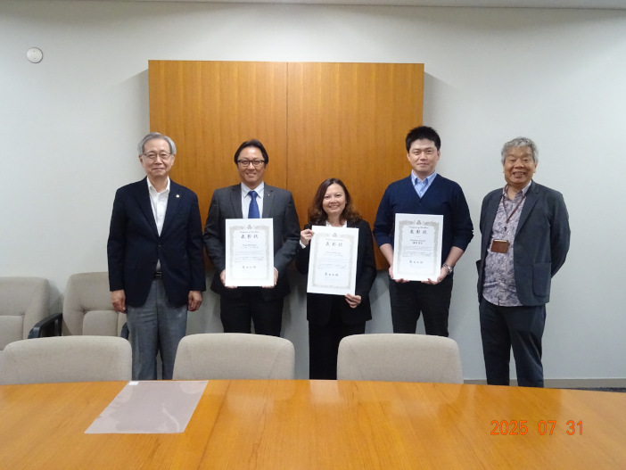 写真左から鹿田正昭校長、トッサ・メブサヤ准教授、ラティヤ・メブサヤ講師、藤島悟志教授、向井守副校長