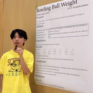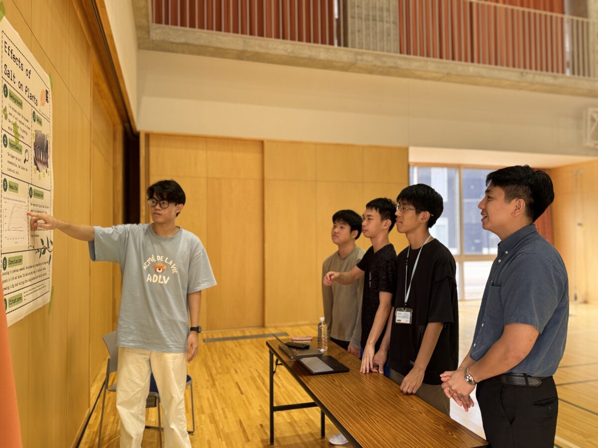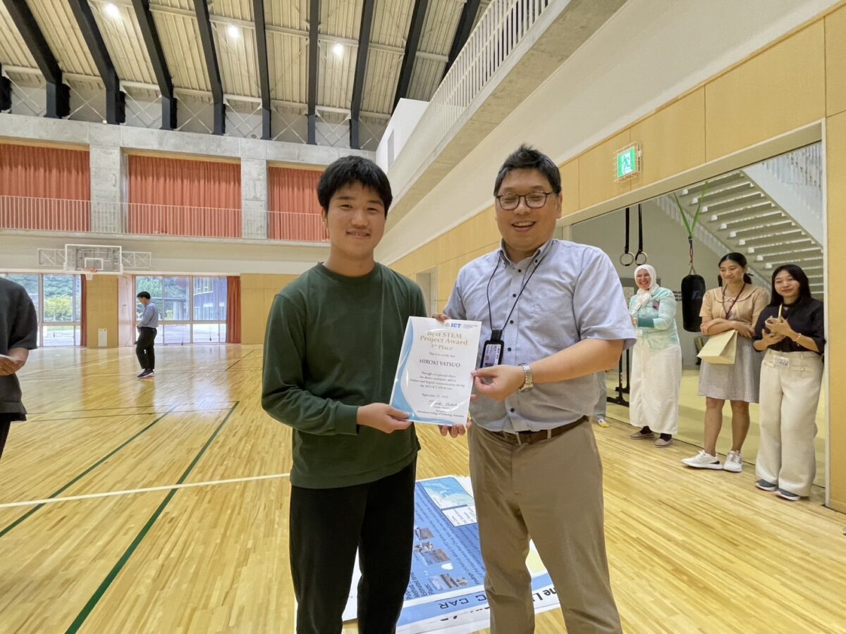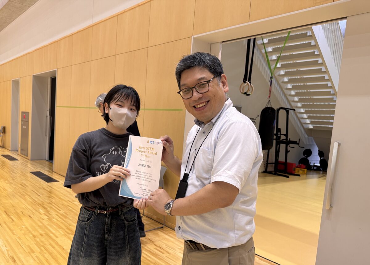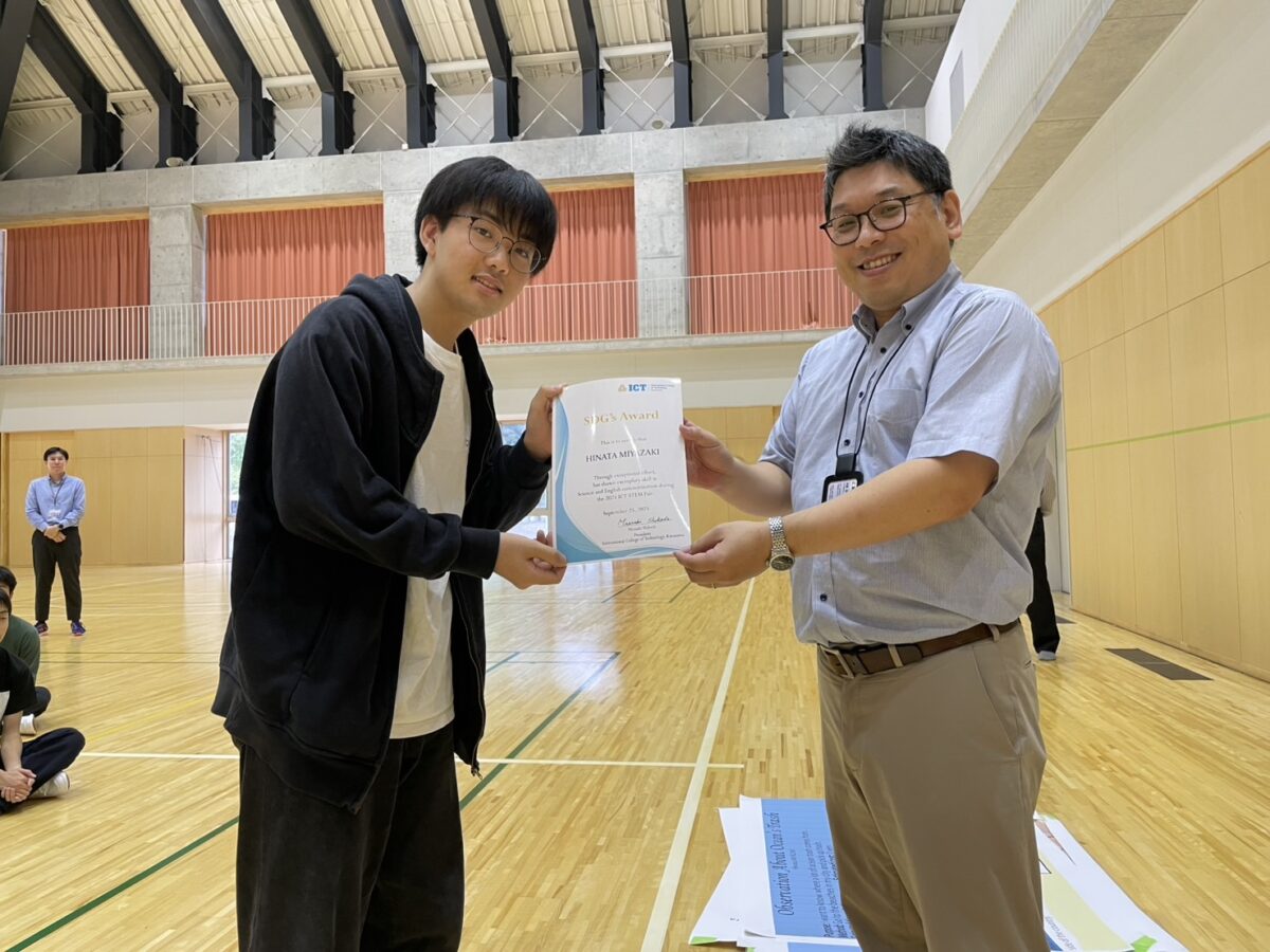 2025年9月25日(木)、10月1日(水)、白山麓キャンパスで1・2年生の「STEMフェア」が開催されました。学生たちが夏休み中に取り組んだSTEMに関連したプロジェクトを発表し、各教員たちによる質疑応答を経て審査が行われました。審査の結果、ベストSTEMプレゼンテーションアワードの1位、2位、SDG’s賞、各STEM科目の担当教員による特別賞の受賞式が行われました。結果は以下の通りです。