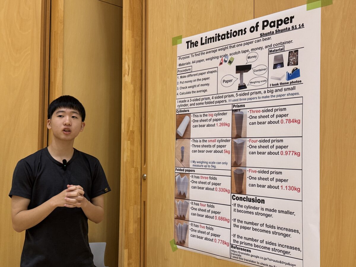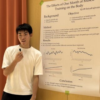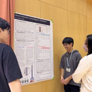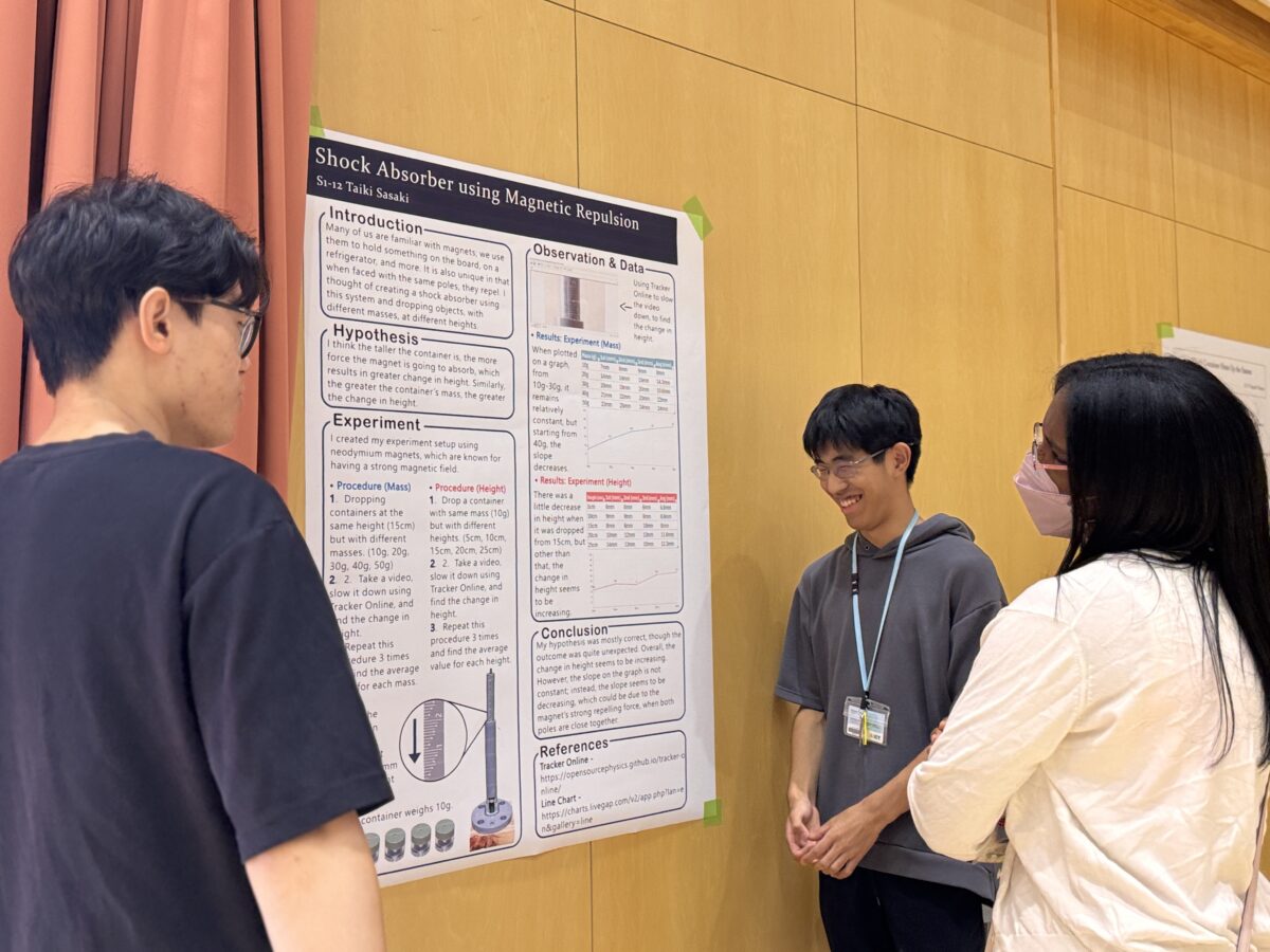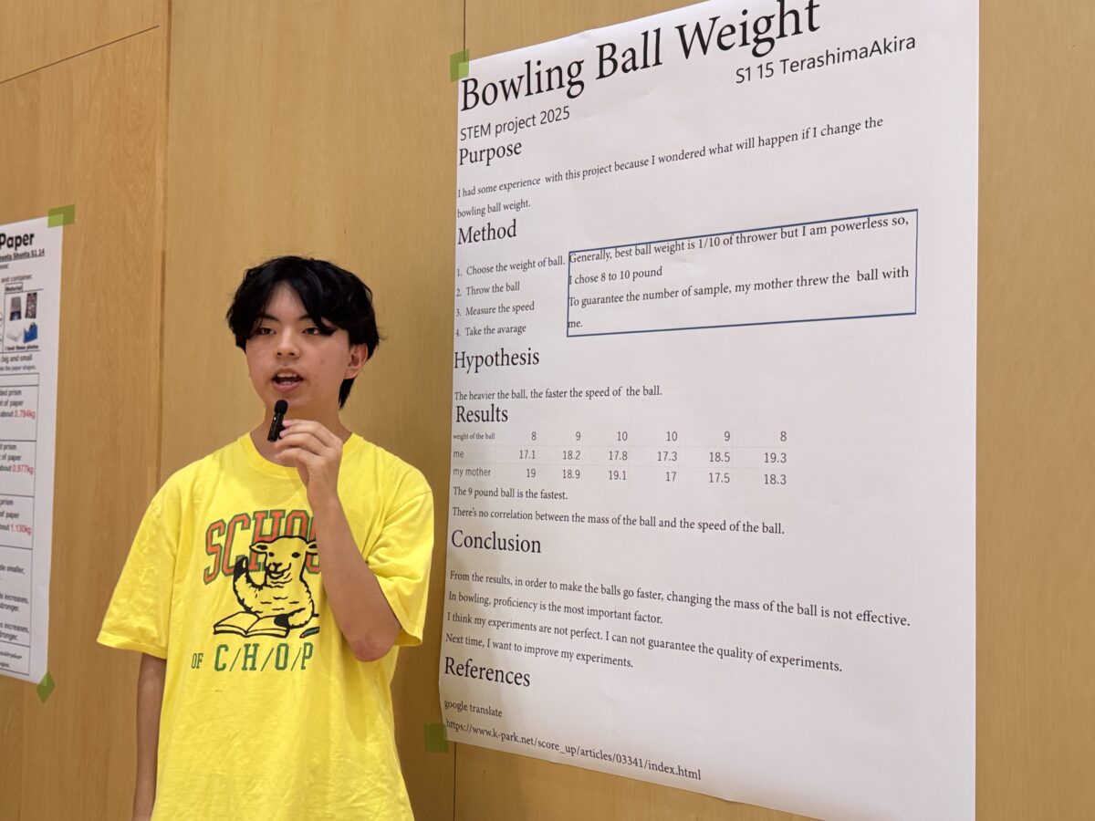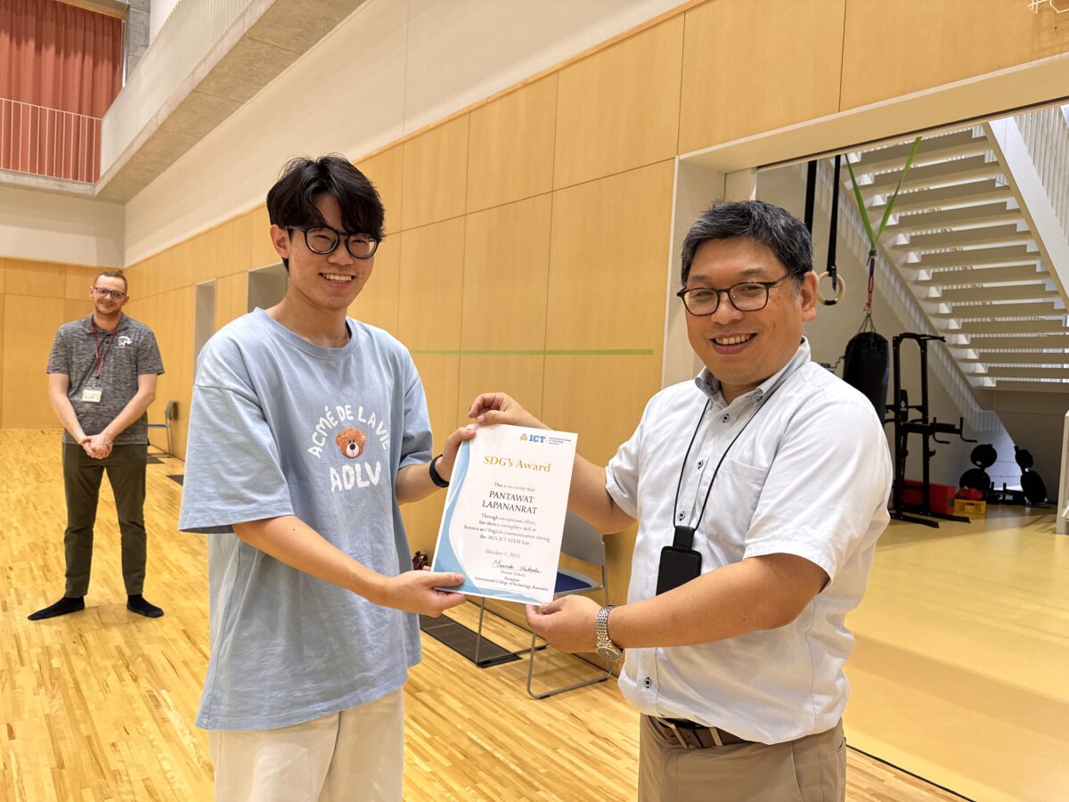 2025年9月25日(木)、10月1日(水)、白山麓キャンパスで1・2年生の「STEMフェア」が開催されました。学生たちが夏休み中に取り組んだSTEMに関連したプロジェクトを発表し、各教員たちによる質疑応答を経て審査が行われました。審査の結果、ベストSTEMプレゼンテーションアワードの1位、2位、SDG’s賞、各STEM科目の担当教員による特別賞の受賞式が行われました。結果は以下の通りです。