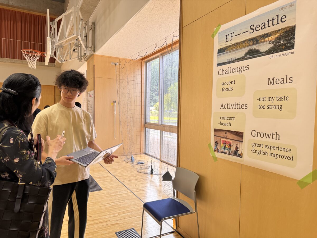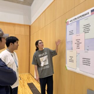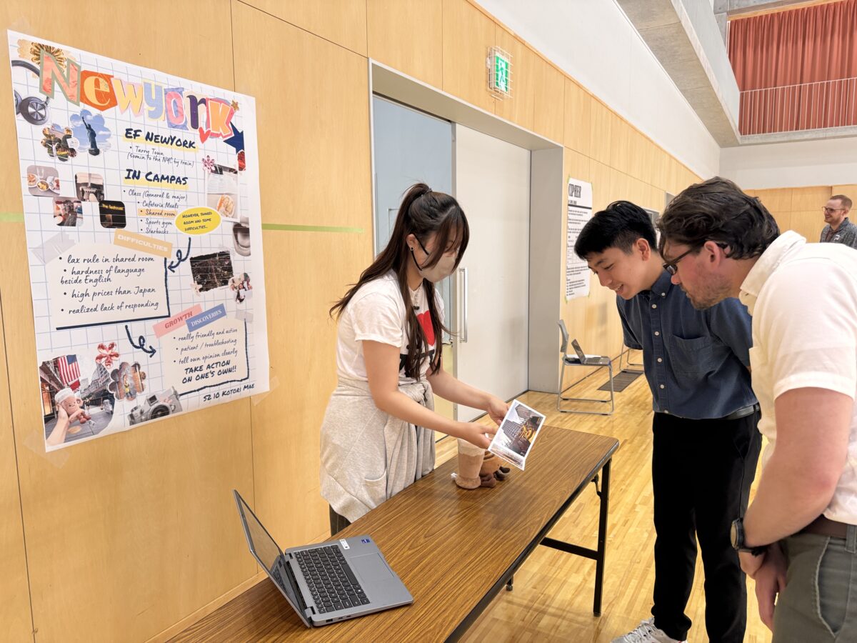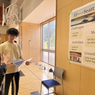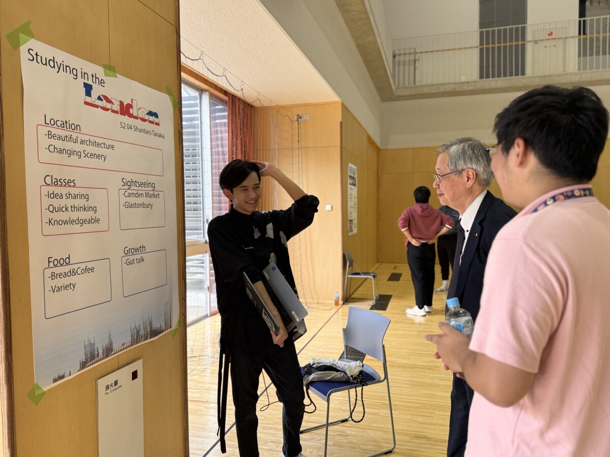 2025年10月1日(水)、白山麓キャンパスで「海外英語研修報告会」が開催されました。2年生4名は今夏にロンドン、ニューヨーク、シアトルで3〜4週間の海外英語研修に参加しました。本科目は、異文化の中での生活や交流を通じて、英語のコミュニケーション能力を向上させることを目的としています。現地の文化や習慣を体験しながら、実践的な英語を学び、国際的な視野を広げることを目指しています。