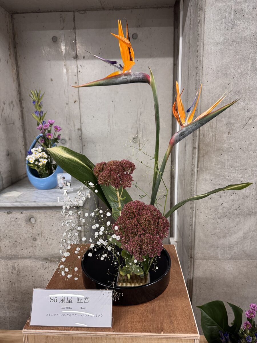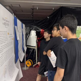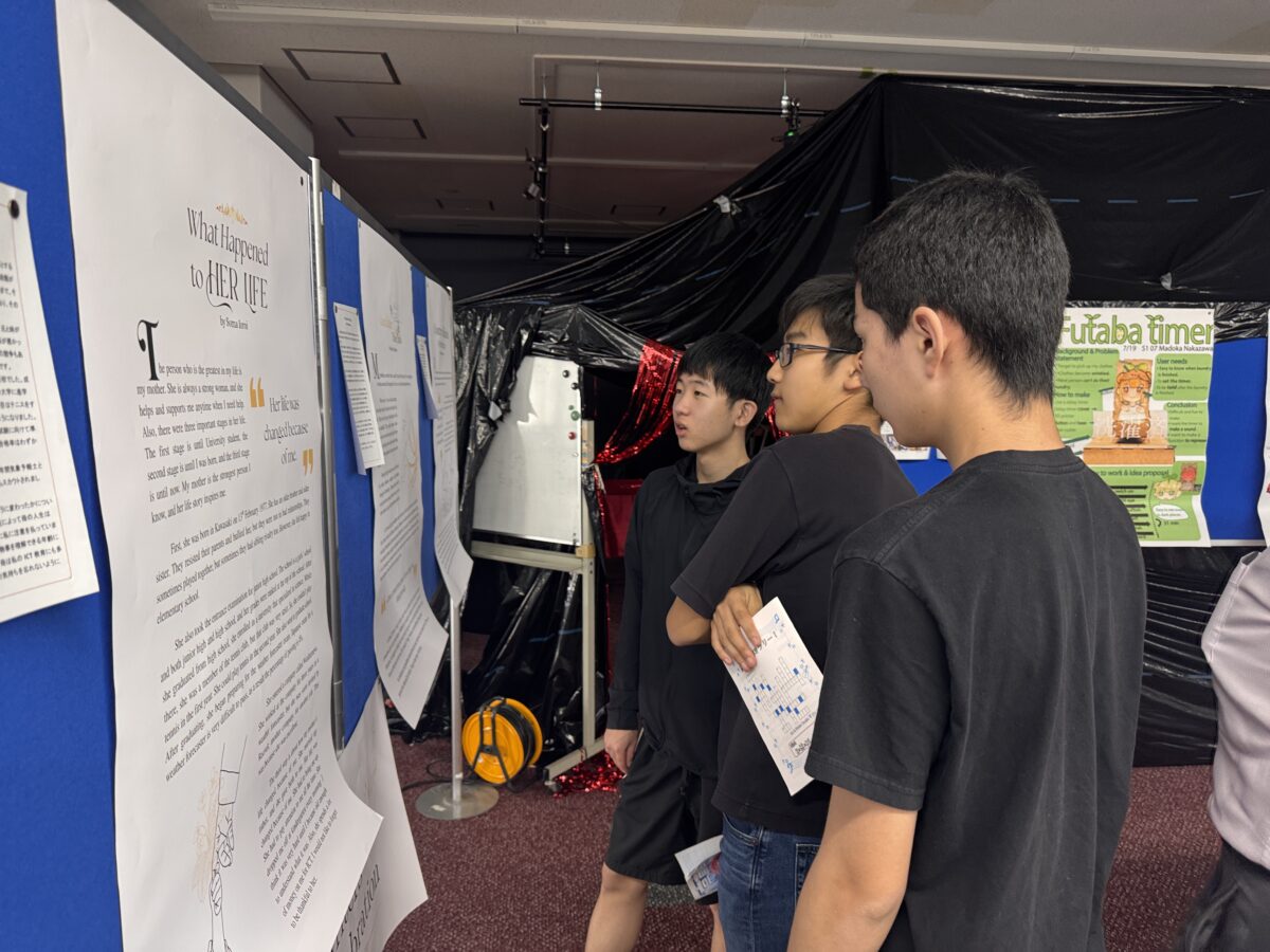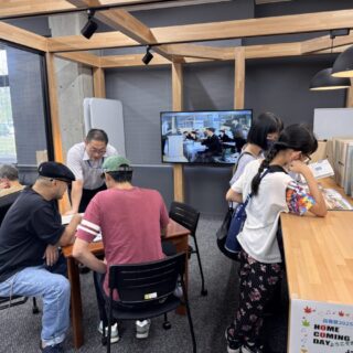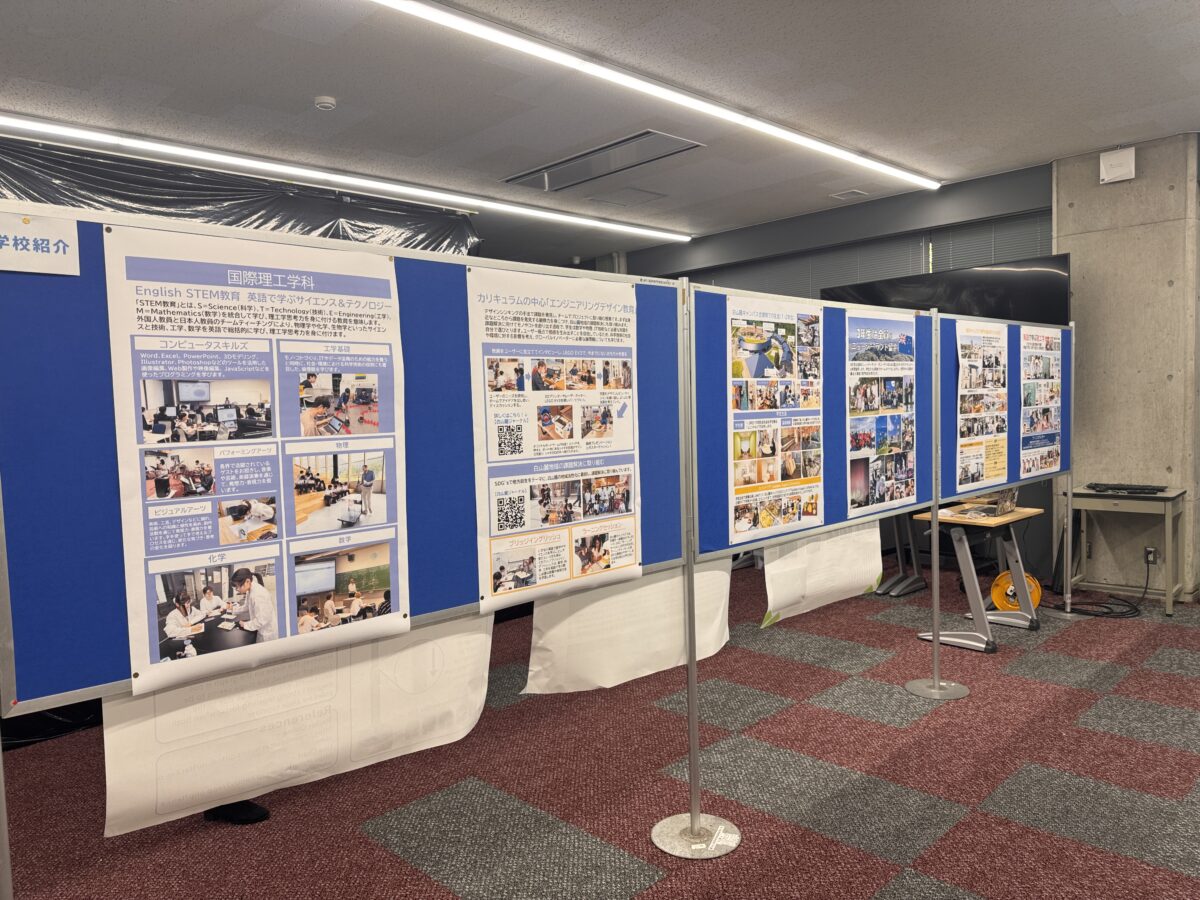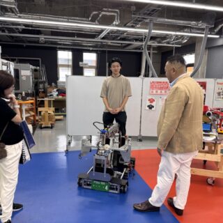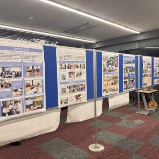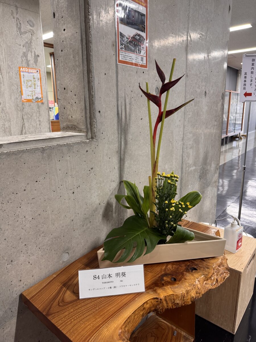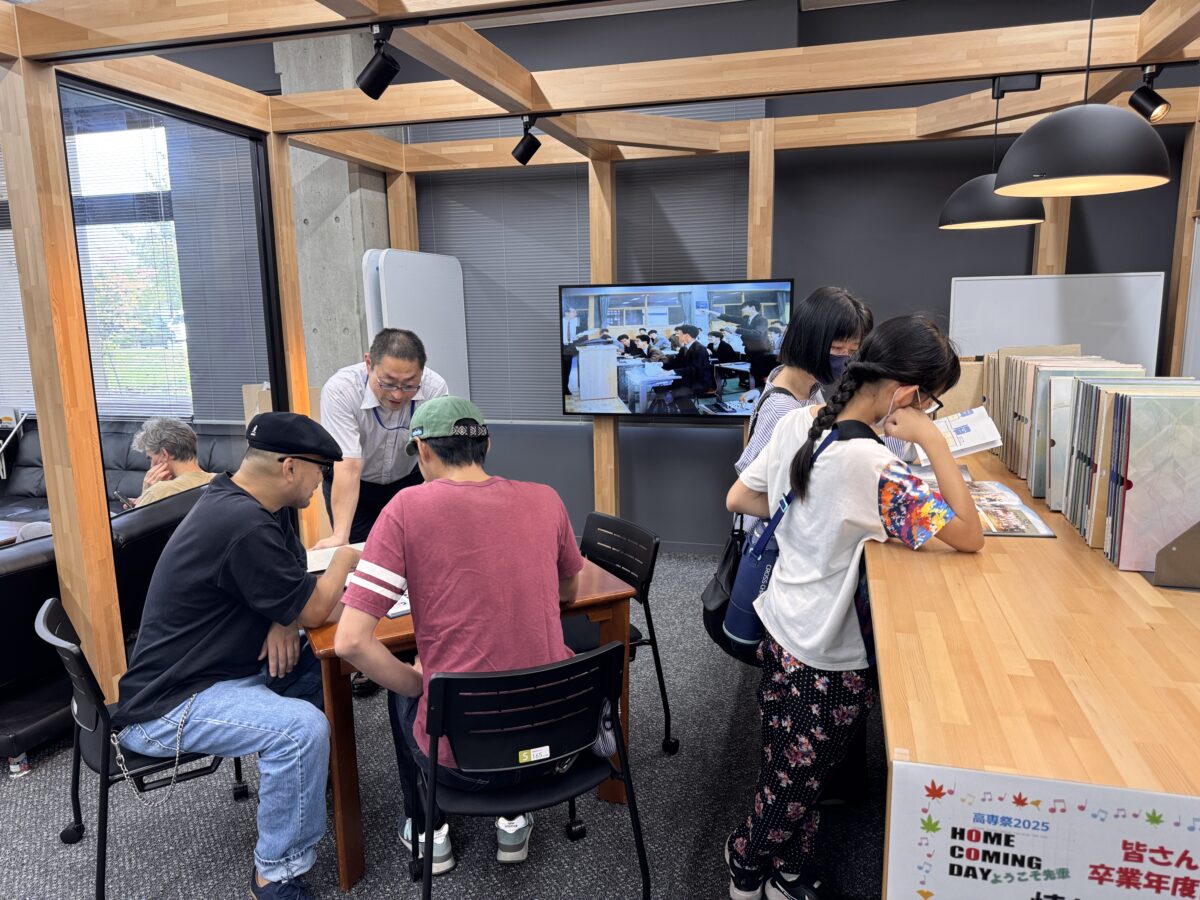 屋内の学科紹介ブースでは、学科紹介ポスターや研究・授業成果の展示を通じて、国際高専の学びを紹介し、学外との交流の場としても活用していました。また、教職員・学生による華道作品や美術作品、ロボコンなど課外活動の展示もあり、授業以外での学生の成果も披露しました。高専同窓会によるホームカミングデイブースでは、歴代の卒業アルバムの閲覧が可能となっており、約20名のOBが訪れ、世代を超えた交流の場となりました。