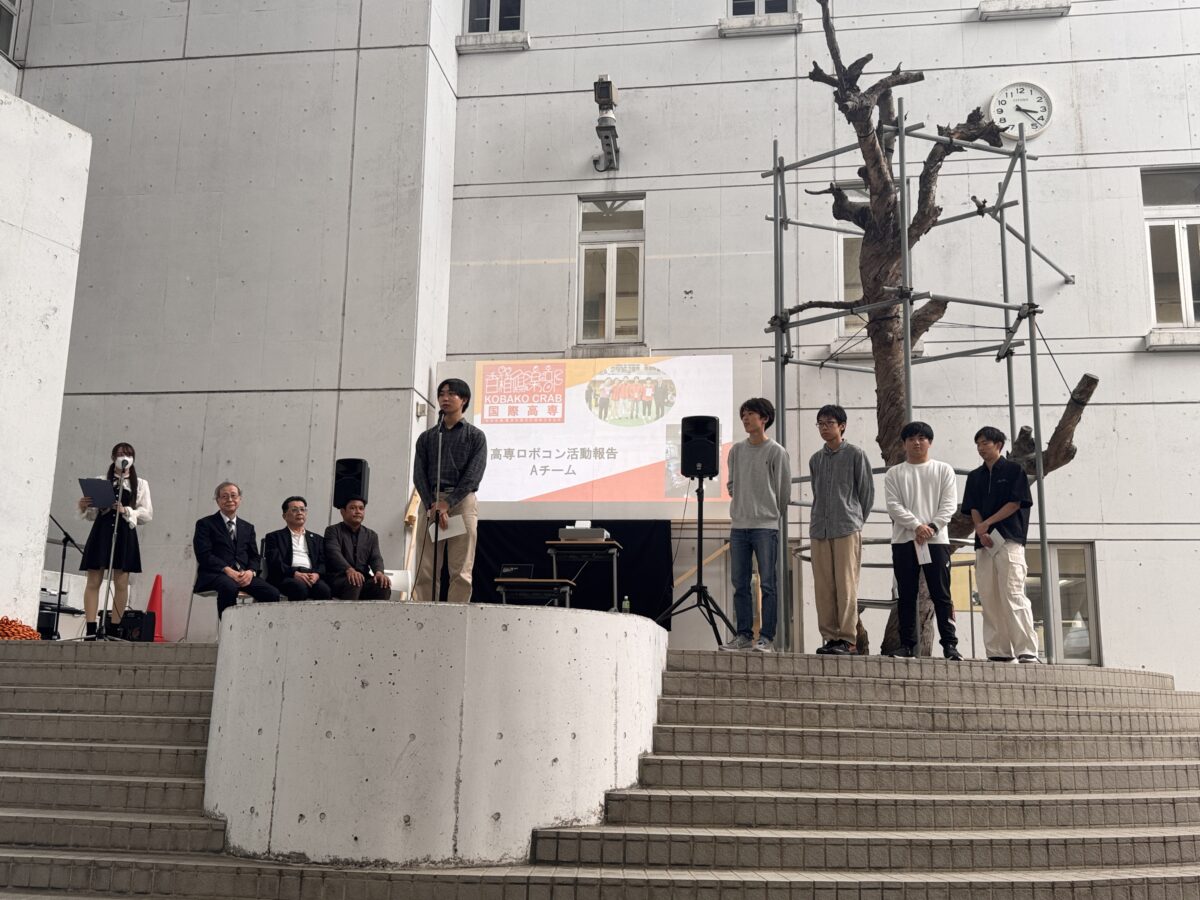 屋外では、5年生による麻婆豆腐の販売、2年生による高専紅はるかの提供、野外ステージでは、プロジェクターを用いた留学生座談会、OBおよび学生のバンド演奏、課外活動報告など新たな企画も加わり高専祭を盛り上げました。高専ロボコン全国大会の壮行会では、同窓会会長、育友会会長、学生会会長、校長先生から激励の言葉が贈られ、Aチーム代表の太田 晴喜さんより、感謝の気持ちと全国大会への意気込みを述べました。最後に、恒例のビンゴ大会で会場は大盛り上がりでした。