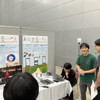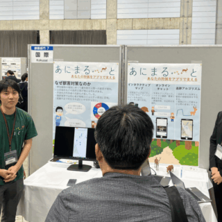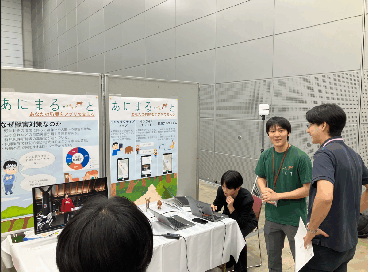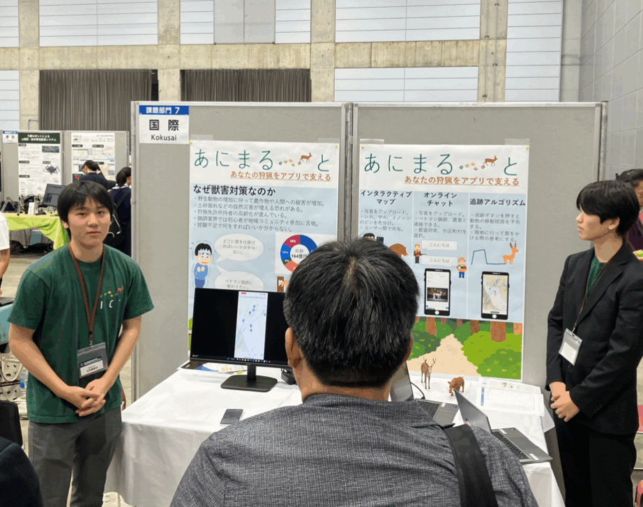 この大会では、課題部門、自由部門、競技部門の3部門で競われ、本校からは2年生の五百蔵 蒼天さん、ラパナンラット・パンタワットさん、1年生の東 藍さん、阿部 晴さん、坂井 麗央さんの5名とサポートメンバーとして1年生の樋口 洸太朗さんが課題部門に出場しました。課題部門には全国から40作品の応募があり、その中から21チームが決勝に出場し、国際高専のチームは見事敢闘賞を受賞しました。今回の課題部門では「ICTを活用した環境問題の解決」をテーマにした作品が募集され、国際高専チームは狩猟初心者をサポートするアプリ「あにまる〜と」を開発・発表しました。