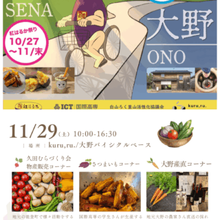 kuru,ru. /大野バイシクルベ―スと国際高等専門学校、白山ろく里山活性化協議会は協同で、地域の特産品や文化を広く発信するため、瀬女・大野エリアの魅力を詰め込んだイベント「紅はるか祭り」×「kuru,ru.コラボ企画」を2025年11月29日(土)に開催します。