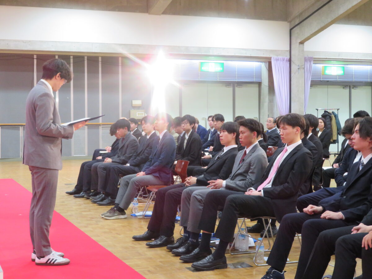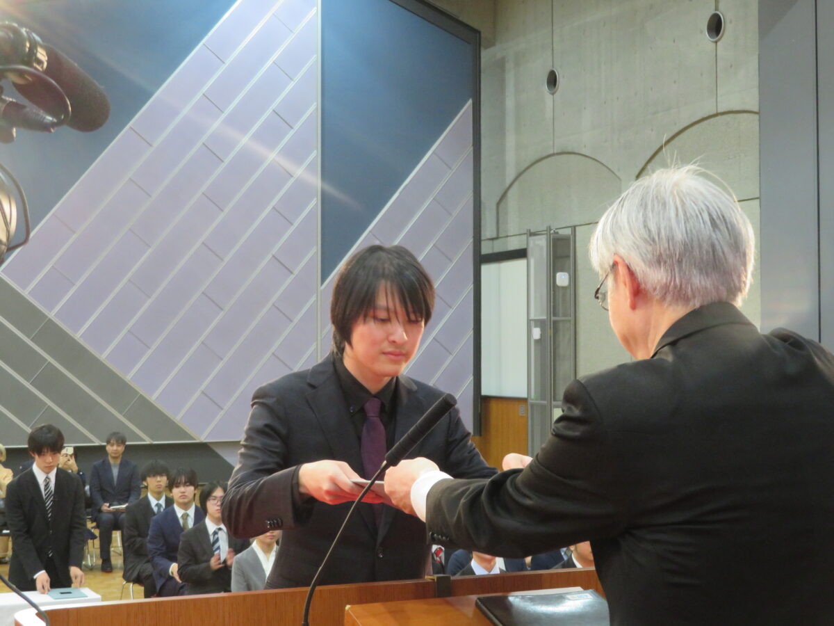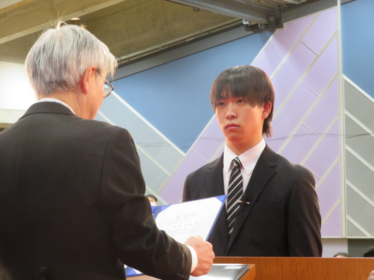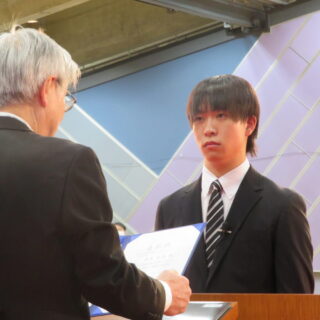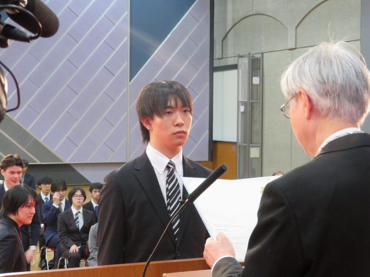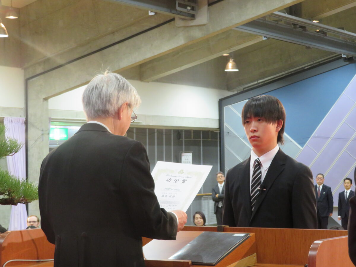 その後、式は賞状授与へと続き、五か年間優等賞が木下 観さんに、五か年間功労賞が泉屋 匠吾さんに贈られました。二つの学会賞は電子情報通信学会北陸支部優秀学生賞が木下さん、情報処理学会北陸支部優秀学生賞が泉屋さんに贈られました。