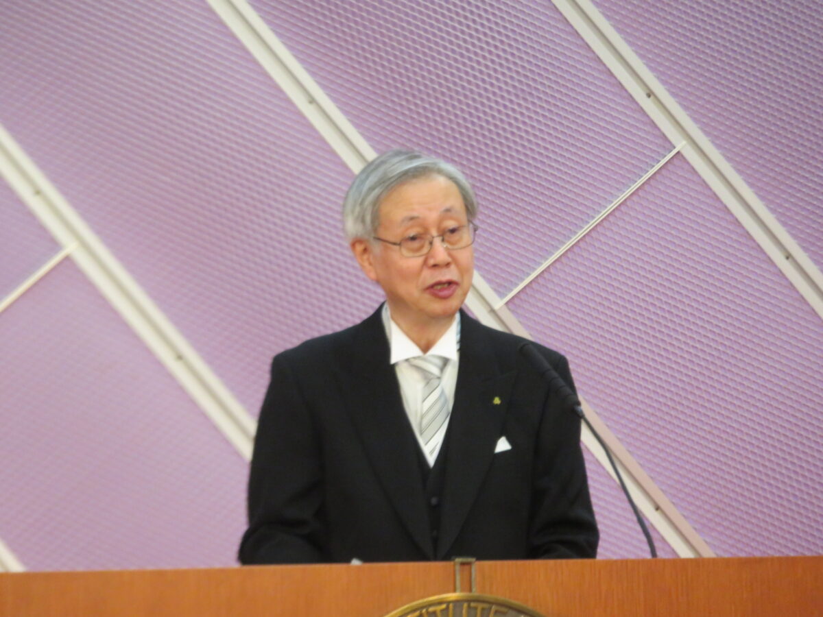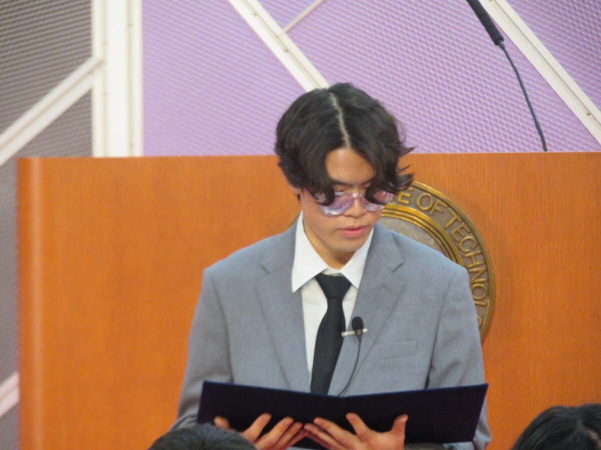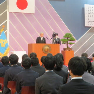 続く校長式辞では鹿田校長が英語で行い、卒業生が一年生として入学した2021年から卒業の日までの各一年の彼等の活躍を紹介ました。さらに「大学に進学しても社会に出ても、ICTで経験しなかった多くの困難が待ち受けています。これは生成AIでは助けてくれません。自ら進んで困難に立ち向かうことで大きな成果が得られると思います。ICTで学んだエンジニア魂をこの先も発揮することを期待しています。」と締めくくりました。
