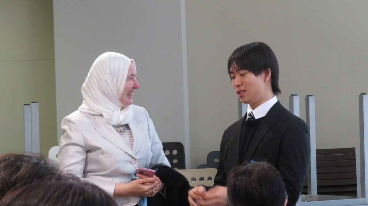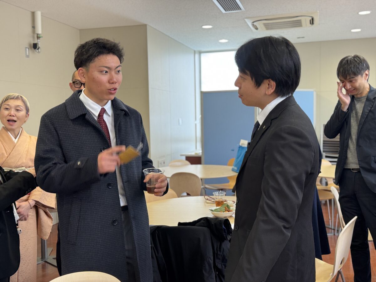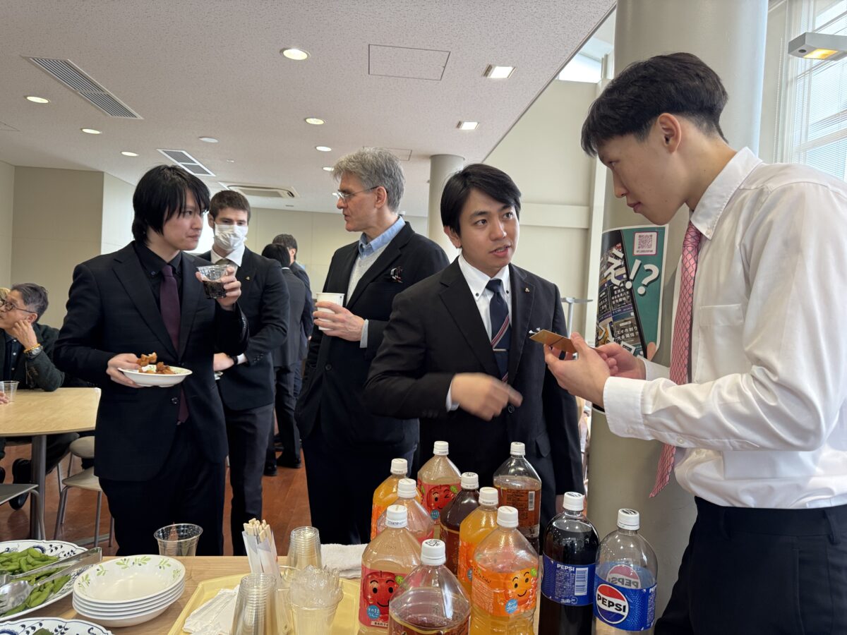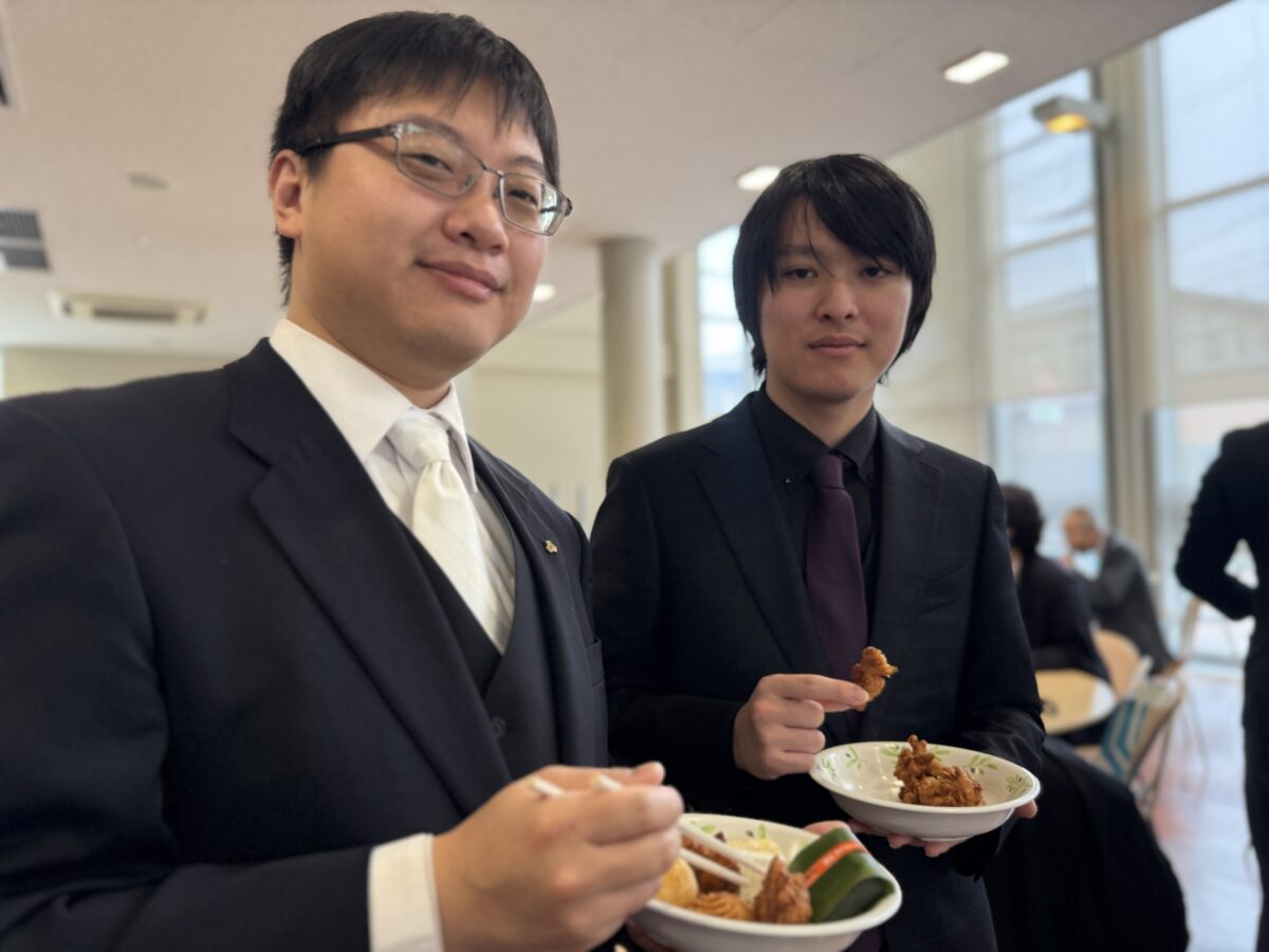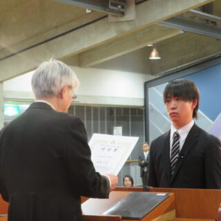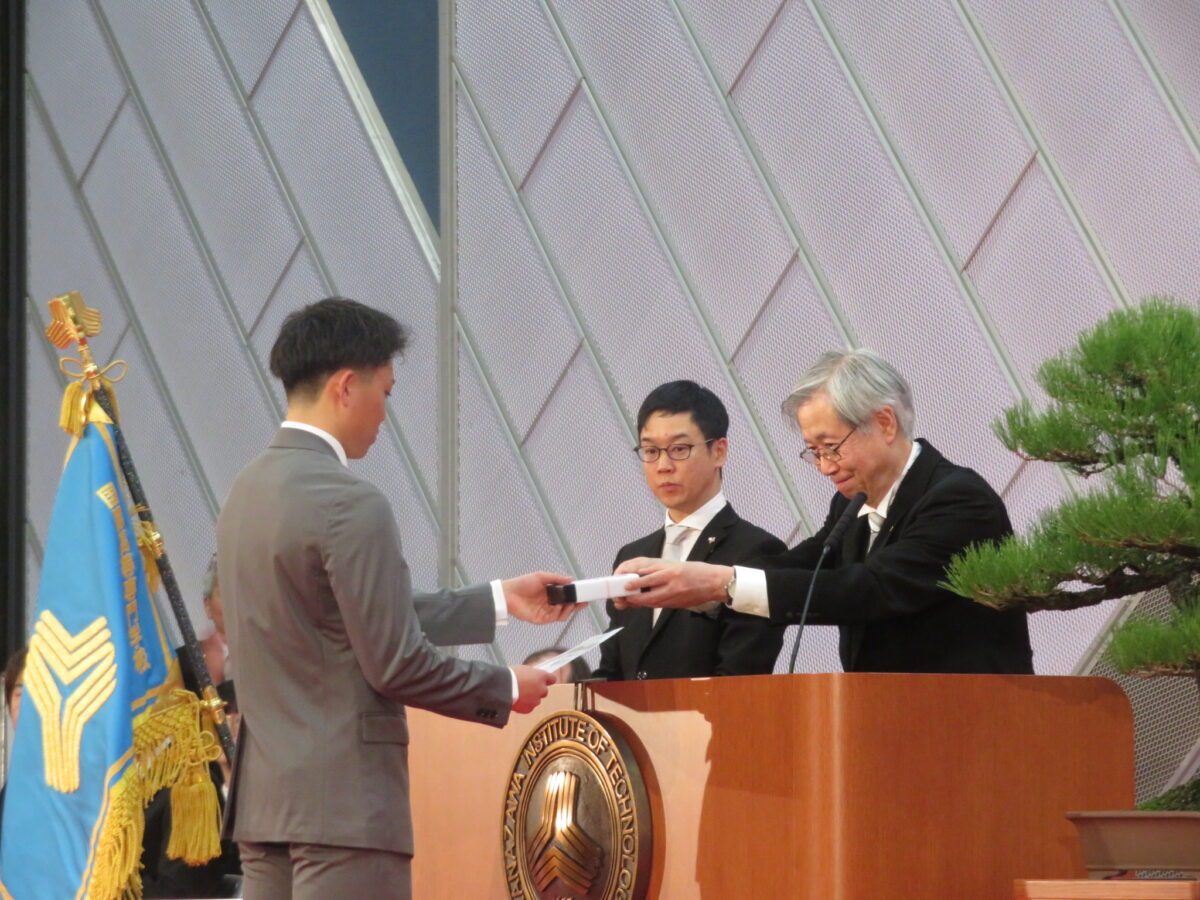 Next, the ceremony moved on to the presentation of awards. The Five-Year Academic Excellence Award was presented to Mr. Kan Kinoshita, and the Five-Year Meritorious Service Award to Mr. Shogo Izumiya. Two academic society awards were also presented: The Excellent Student Award of the Hokuriku Chapter of the Institute of Electronics, Information and Communication Engineers to Mr. Kinoshita, and the Excellent Student Award of the Hokuriku Chapter of the Information Processing Society of Japan to Mr. Izumiya.
