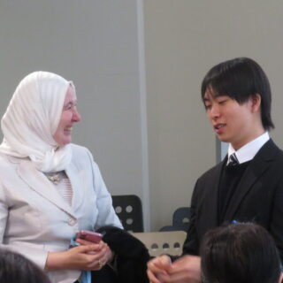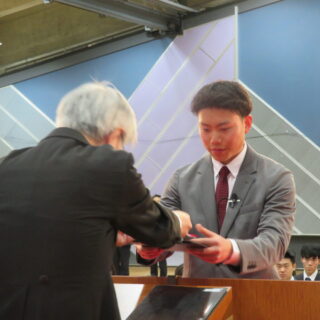 The ceremony began under the moderation of Justin Han sensei, followed by the opening address delivered in both Japanese and English by Vice President Mamoru Mukai sensei. After the singing of the national anthem and the school song, the ceremony proceeded to the presentation of diplomas. When students’ names were called by their homeroom teacher, Yoshihiro Kushima sensei, each graduating student stepped forward to receive a bilingual diploma from President Masaaki Shikada sensei.