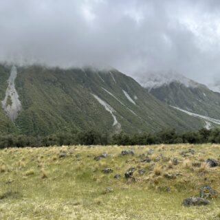 星空に圧倒され、2日目3日目ともに悠々と過ごし、Tekapoでの生活を堪能し終えると、我々は最後の自然の名所旧跡としてMt Cook(Aoraki)を訪れます。Mt Cookは国立公園に指定されているほど、貴重な自然が集まる場所です。ここで私たちは軽いハイキングコースを2本ほど歩かせていただきました。この日は大変な曇りで、山頂に雲がかかってよく見えず、少し落胆していました。しかし、ドライバーさんのご説明によると、Aorakiは雲に関係する単語だそうで、雲の神と大地の神が引き離された神話のお話など、たくさんのマオリ文化のお話を聞かせていただきました。おかげで、最悪と思われた曇天模様は、むしろ神秘的に感じることができました。