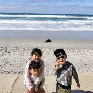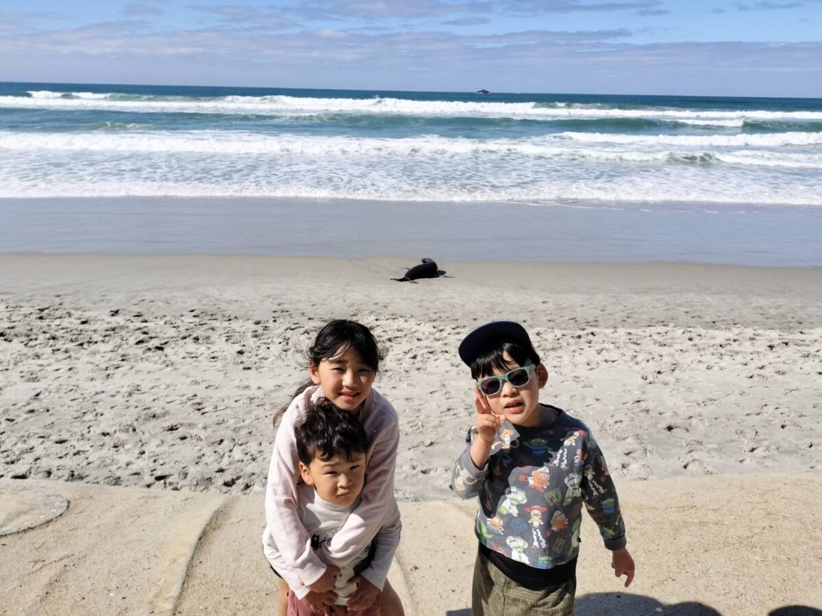 At the beach, 10 minutes from our house. There is a sealion behind them. 家から車で10分のビーチにて。シーライオン(アシカ)によく遭遇します。