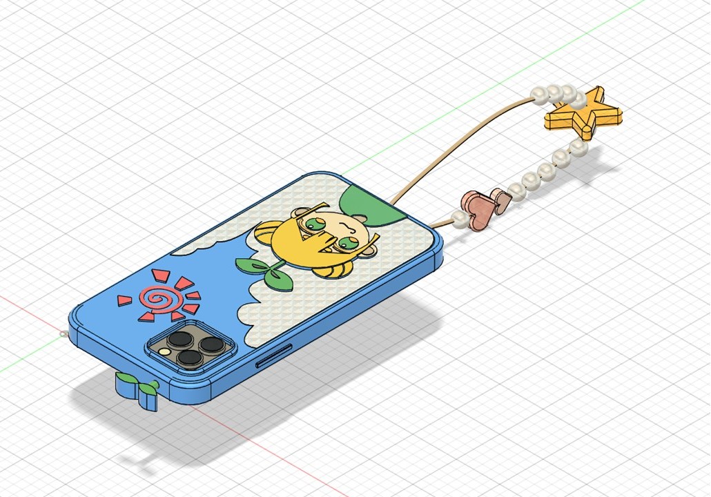 まず、2年生中澤 円香さんの作品「わたしのスマホ」です。幾何学的な形状としてはシンプルなスマホをモデリングしていますが、かなりデコっています。円弧や直線の組み合わせで、かわいらしいキャラクターをうまく再現しています。ストラップのビーズの表現も上手です。輝く太陽もCADでは難しいと思われる手書き風にモデリングされています。画面が割れているところまで表現しているのも、手が込んでいました。