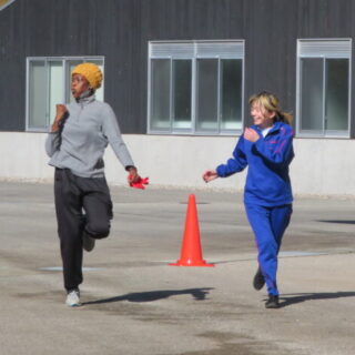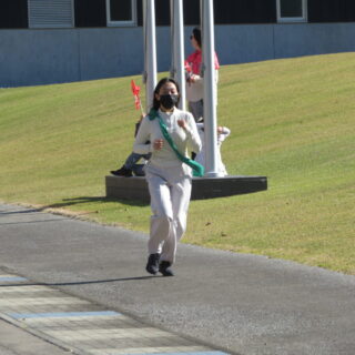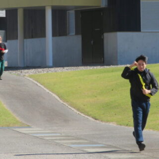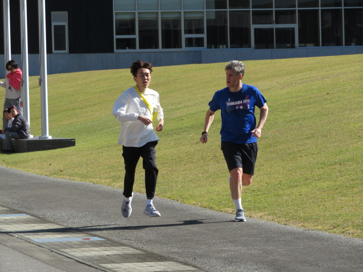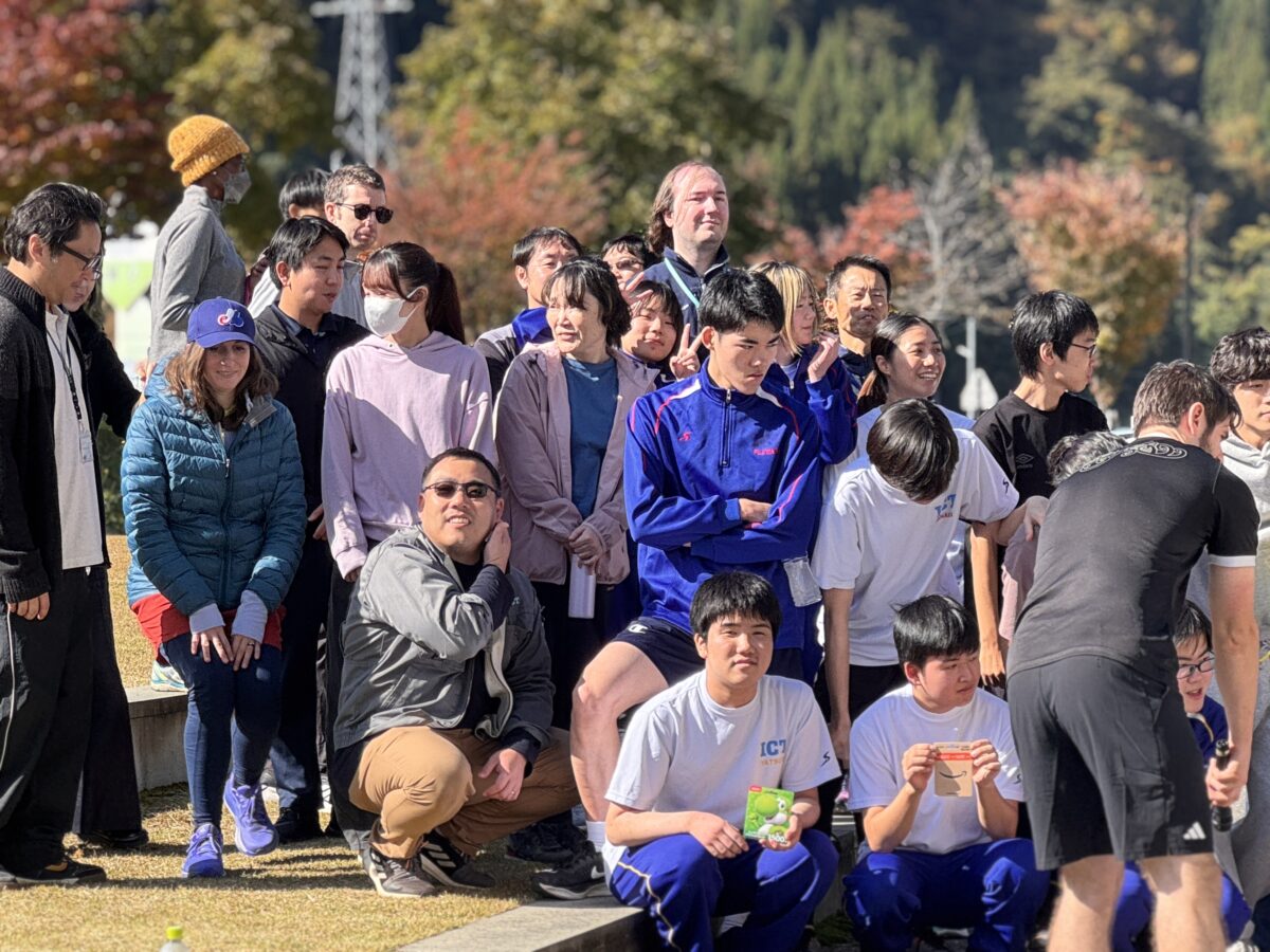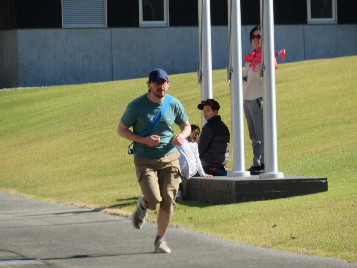 その中、イアン・スティーブンソン先生は自分の順番以外でもずっと走り続けました。学生たちの間で、「イアン先生は何周走った?」という即興のクイズも始まり、彼の走り続ける姿は観客にとって刺激になっていました。レースは続き、タスキの受け渡しごとに歓声が上がり、誰もが主役になれる瞬間がありました。残念ながら、昨年同様に足首や呼吸がしづらい症状を訴えた参加者がいましたが、その人数は昨年より少なく、自覚症状のレベルですみました。最後の周回が終わり、結果は驚くほど接戦!時計やスマホで時間を確認できない中、全チームが目標の80分以内に10分差で収まりました。