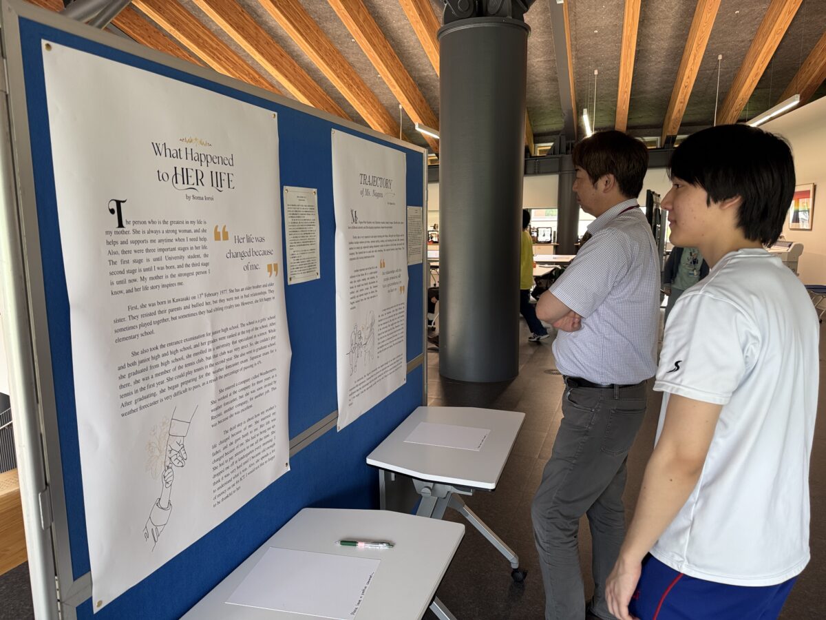 学生たちは、自分の作品を英語と日本語で掲示板に貼り、他の学生や教職員に披露しました。その様子を見て、私は「家族の物語を書くこと」が、学生たちが作家として、また思考する人としてのアイデンティティを育むための特別な窓(きっかけ)となることに気づきました。
