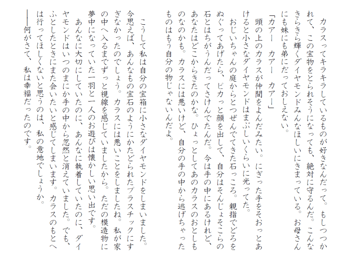 伊藤さんは最初「宝石」や「王冠」を挙げていましたが、記憶を辿るうちに「祖父の家の庭で見つけた宝石のようなもの」を思い出しました。子どもと大人の文体を使い分け、大胆な構成になっています。