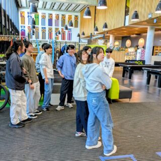 その後はキャンパスツアーとして学内を散策しました。運動施設「Unipol」では、その充実した設備に学生たちが感動し、「早く利用したい」という声が多く聞かれました。Unipolは体力づくりの場としてだけでなく、現地の学生との交流の場としても重要な施設です。また、図書館では多くの学生が静かに学習に励む姿が見られ、その様子に刺激を受けている様子でした。学生たちは、このような恵まれた環境の中で学び、生活できることへの期待を一層高めるとともに、ここで過ごす日々が、学びだけでなく生活そのものとして始まっていくことを肌で感じた時間でした。