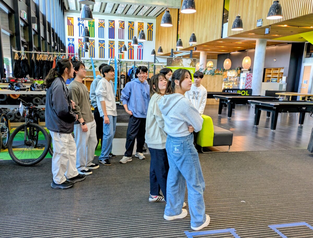 プログラム初日には、マオリの伝統的な様式による歓迎式が行われました。オタゴポリテクニク教職員の皆様による歌声と、心を込めたスピーチから、この場所の歴史と温かな歓迎の気持ちが伝わってきました。それに応えるように、本校からは万江 琴莉さんが代表としてスピーチを行い、続いて学生全員で「ひまわりの約束」を披露しました。この曲は、ひまわりが太陽を見つめ続ける姿になぞらえ、時間や距離を越えて相手を想い続ける愛情や友情、そして変わることのない絆を表現したものであり、学生自身がこの場にふさわしい一曲として選んだものです。会場に広がった歌声は、言葉の壁を越え、人と人との距離をぐっと近づける力を持っていました。