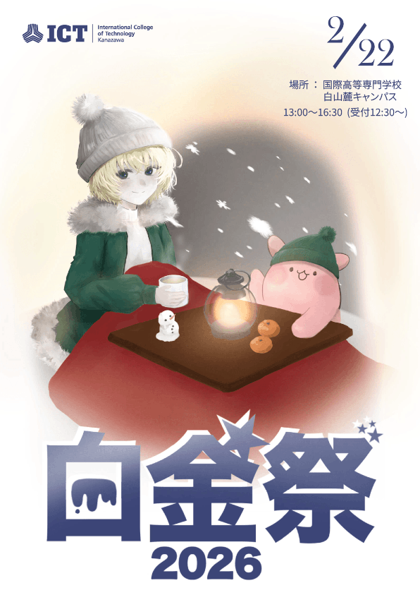 国際高専白山麓キャンパスで、白金祭を開催します。 白金祭は学生の「やりたい!」がたくさん詰まったICTの恒例行事です! 有志企画やステージ発表など、見どころ満載の一日になっています。 最高の思い出を届けられるように取り組んでいます! ぜひ白金祭に遊びに来てください! 開催日:2026年2月22日(日) 開催時間:13:00〜16:30(受付:12:30~)※出入り自由 無料送迎バスを運行します。 【行き】 11:20 JR金沢駅(金沢駅西広場団体バス乗降場)集合 11:30 JR金沢駅 出発 12:45 白山麓キャンパス到着 【帰り】 16:45 白山麓キャンパス出発 18:00 JR金沢駅到着 ※到着時刻は混雑状況により前後する場合があります。 白金祭への参加をご希望の方は、以下の申込フォームにてお申し込みください。 申込締切は2月18日(水)12:00までです。 *は必須項目です。 プライバシーポリシーについて 必須参加者氏名(漢字) 必須参加者氏名(カナ) 学校名 必須属性 中学1年生 中学2年生 中学3年生 既卒 保護者 学校・塾教職員 その他(小学生等)※学校名に学年も入力してください。 必須携帯電話 本校からの連絡用として使用させていただく場合があります。 必須メールアドレス 本校からの連絡用として使用させていただく場合があります。 E-mailでの配信を希望しない 国際高専の入試情報、ニュース、イベントなどの最新情報をE-mailにて配信いたします。 配信を希望されない方は、ボタンをクリックしてください。 必須メールアドレス(確認用) 必須無料送迎バス 白山麓キャンパスまで無料送迎バスを運行します。 バスは予約制です。 ご利用の有無をお選びください。 利用しない JR金沢駅発着 変更の場合はメールにてご連絡ください。 メールでご連絡 必須同行者参加人数 名 変更の場合はメールにてご連絡ください。 メールでご連絡 質問等がありましたら ご記入ください。 プライバシーポリシーを承認する