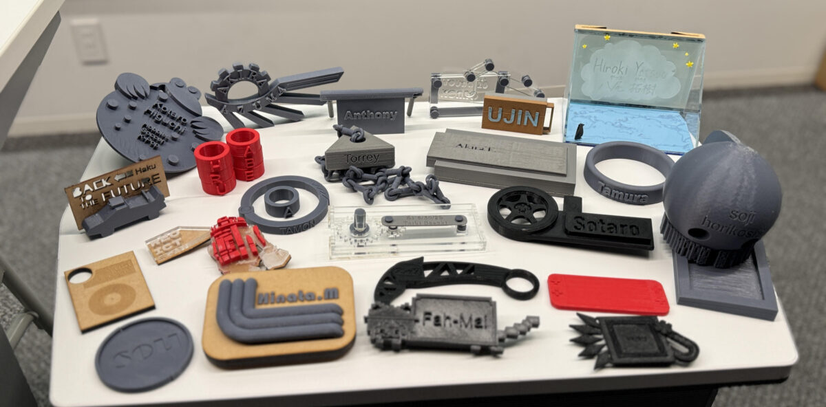 There were some criteria that the students needed to follow during the project: their nametag needed to be able to be worn, it needed to fit within a certain volume, it needed to be made using the 3D printers and/or laser cutters that we have here at Hakusanroku Campus, and it needed to visually show important characteristics about the designer.