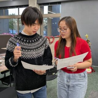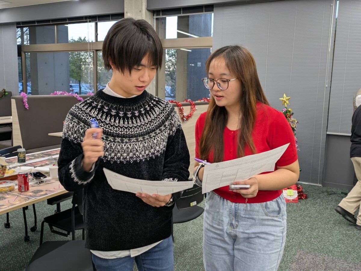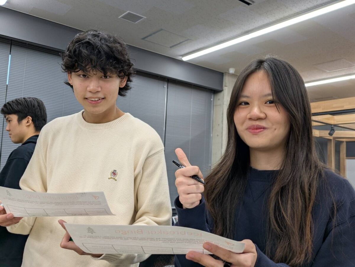 12月19日の放課後に開催されたクリスマスイベントは、英語科によるICT初の「クリスマス・スクラブル・トーナメント」から始まりました。1年生と2年生の学生が混成チームを組み、ものすごい速さで単語を作っていきました。中には、ボードゲームが初めてにもかかわらず、400点以上を獲得した学生もいました!優勝チームには賞品が贈られましたが、それ以上に、参加した全員が達成感いっぱいの笑顔で終えることができました。