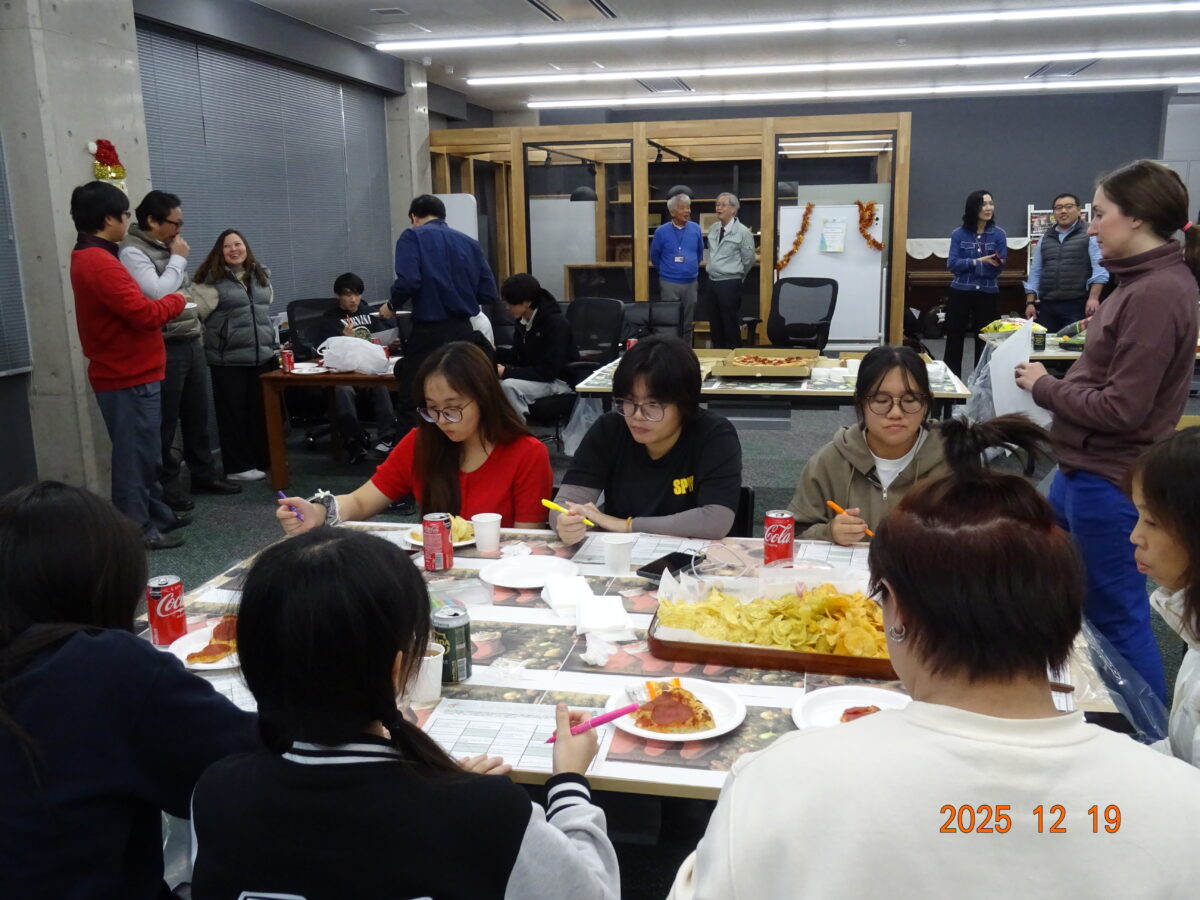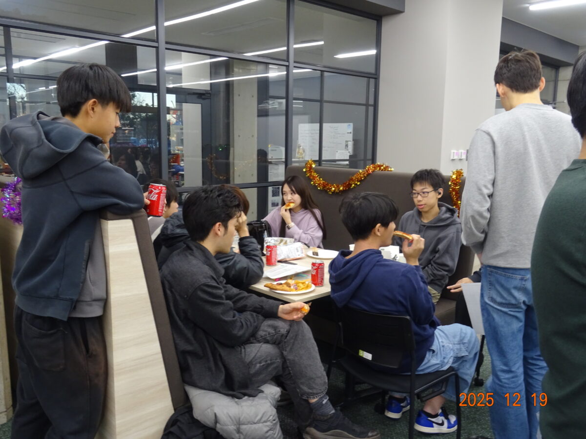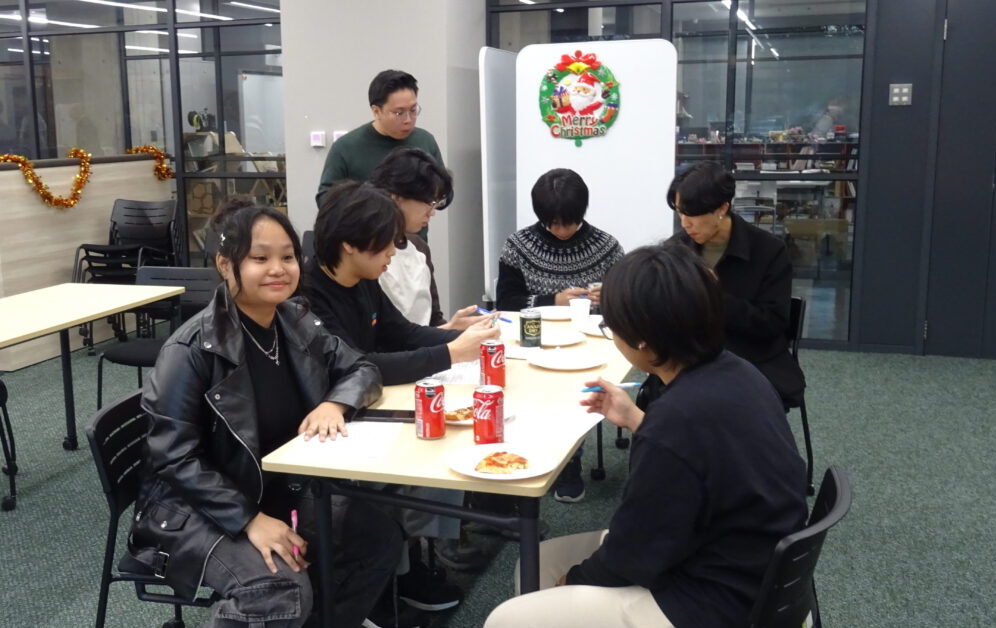 今年のホリデーパーティーは、12月19日(金)の授業終了後に開催され、クリスマスソングが流れる中、学生と教員はピザ、ポテトチップス、ソーダ、ケーキといったシンプルな料理を楽しみました。クリスマスは多くの文化で最も広く祝われる行事の一つであるため、部屋はクリスマスツリーや飾りで彩られ、華やかな雰囲気に包まれていました。