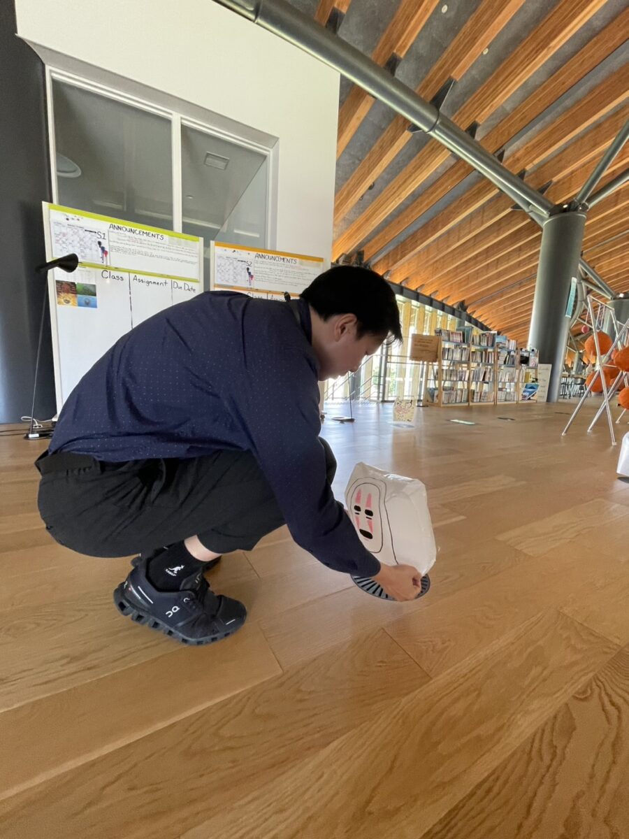 A 2nd year student adjusting the robot, watched by a 1st year student (Team B)キャンパスでロボットの調整をする2年生と見守る1年生(Bチーム)