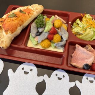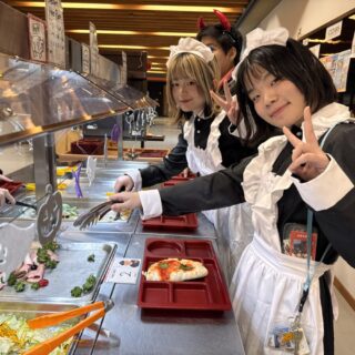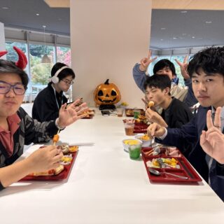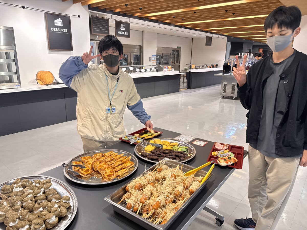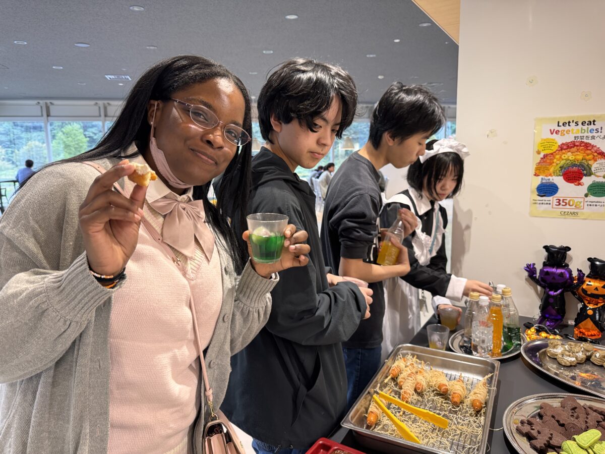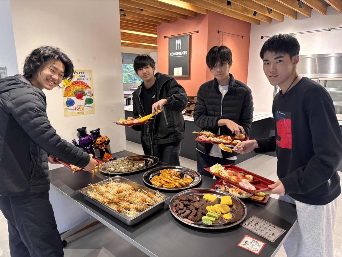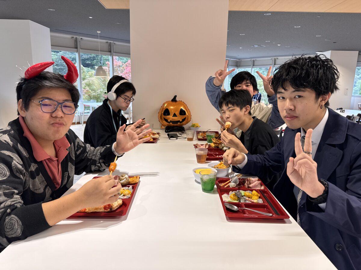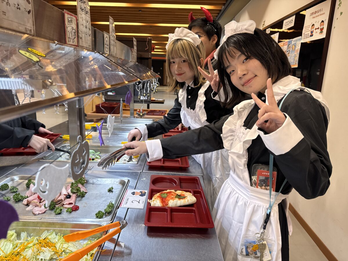昼食にはハロウィン特別メニューが提供され、吸血鬼のごちそうピザ(中にチーズが入っていてとても美味しかったです!)、芋虫の形をした不気味な色のパスタ、さらに約10種類のお菓子が取り放題で並び、学生たちは楽しそうに食事を満喫していました。