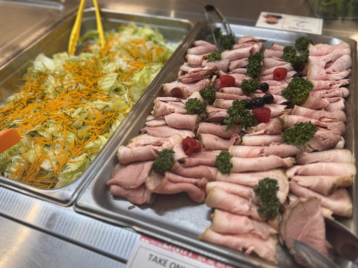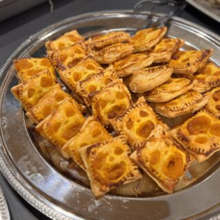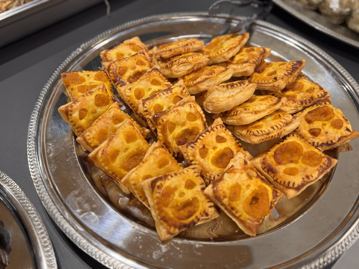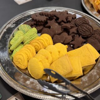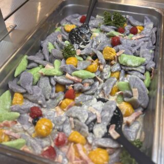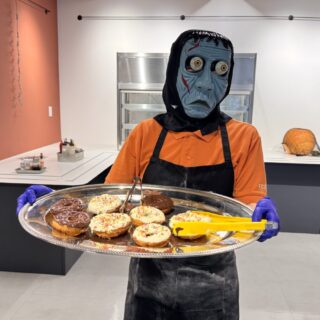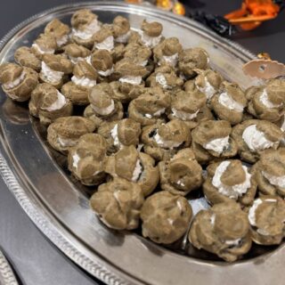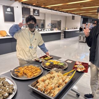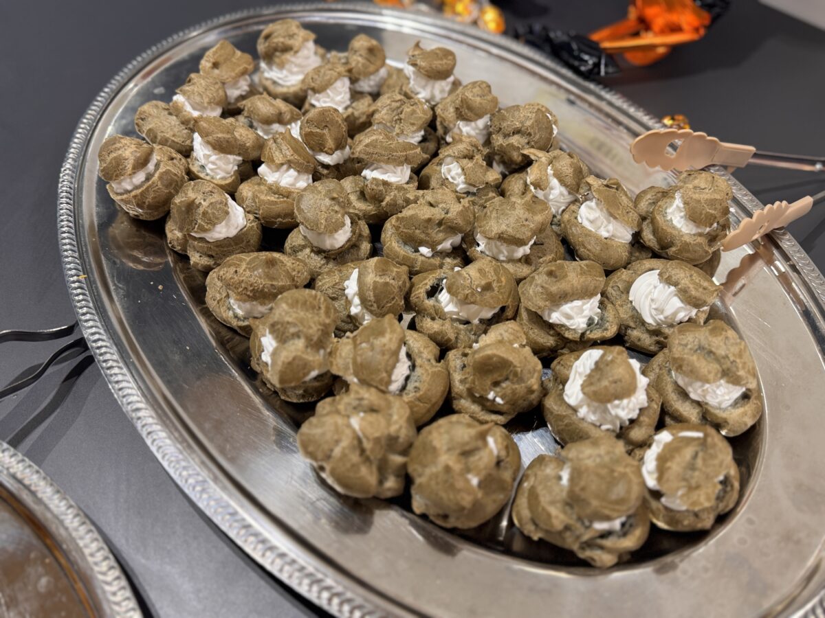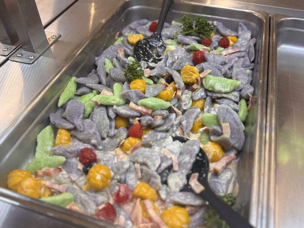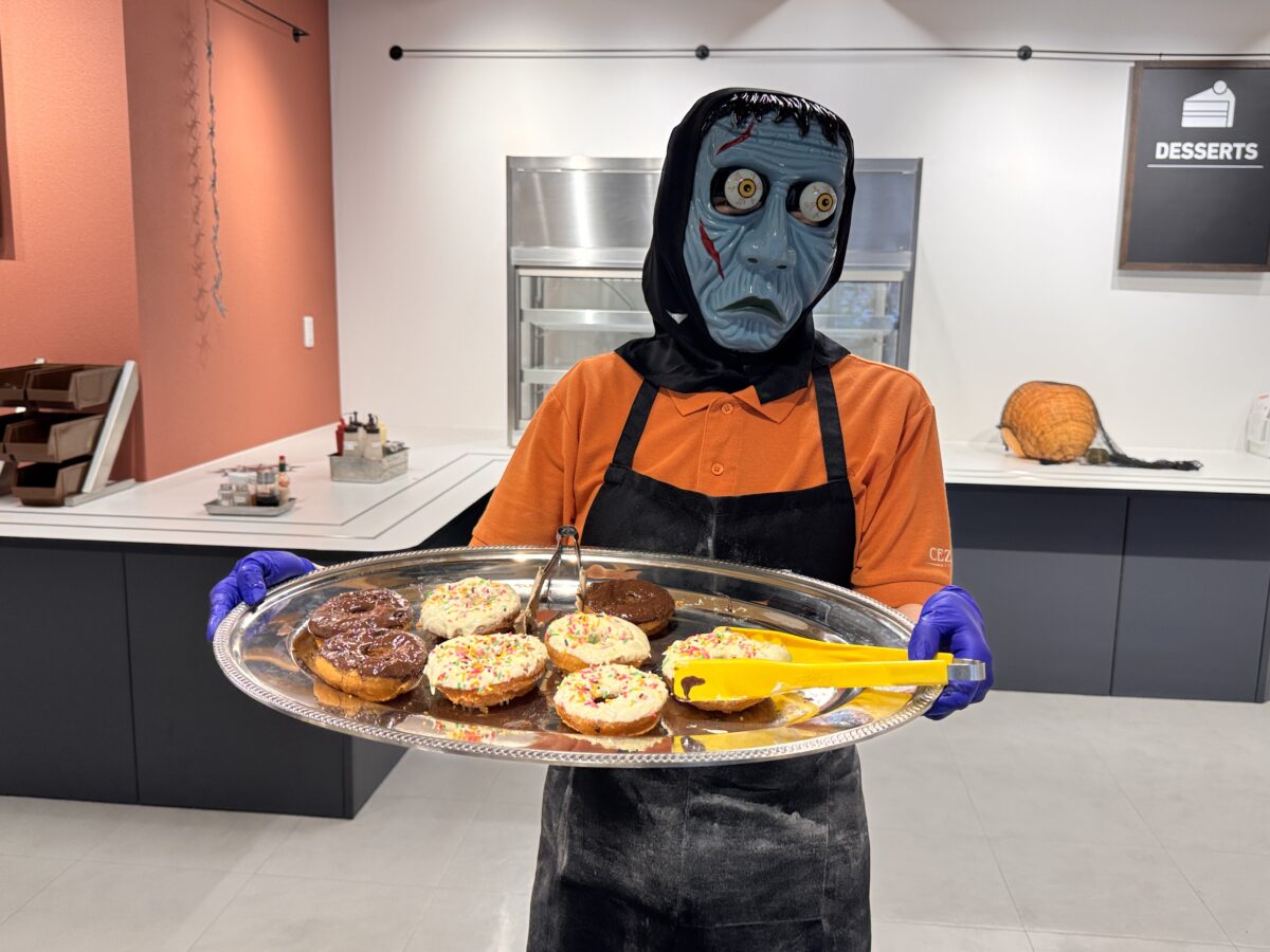 昼食にはハロウィン特別メニューが提供され、吸血鬼のごちそうピザ(中にチーズが入っていてとても美味しかったです!)、芋虫の形をした不気味な色のパスタ、さらに約10種類のお菓子が取り放題で並び、学生たちは楽しそうに食事を満喫していました。