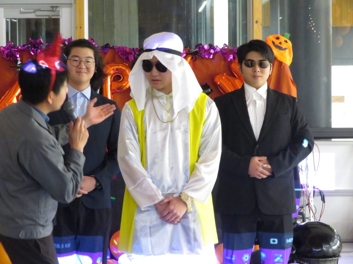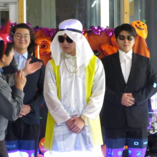 As the classes came to an end, even more students joined in with creative costumes. One student a horse headpiece paired with a sumo outfit, another dressed up as an Arabian sheik accompanied by his bodyguards, and another student transformed ordinary red clothes into cape-like design for unique look. During the Halloween parade, students struck confident poses on stage, captivating the audience. Laughter and cheers filled the atmosphere, making the event lively from start to finish.
