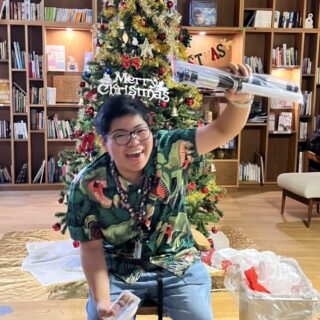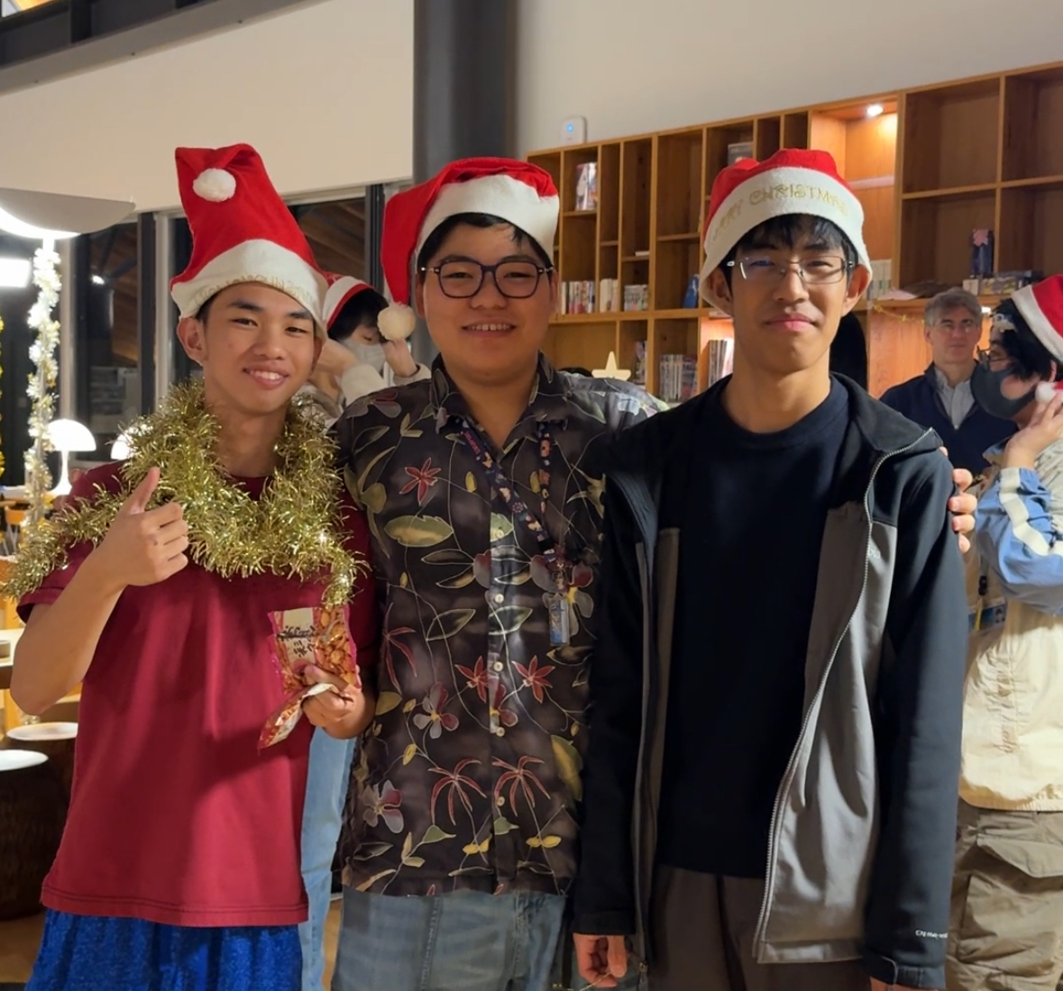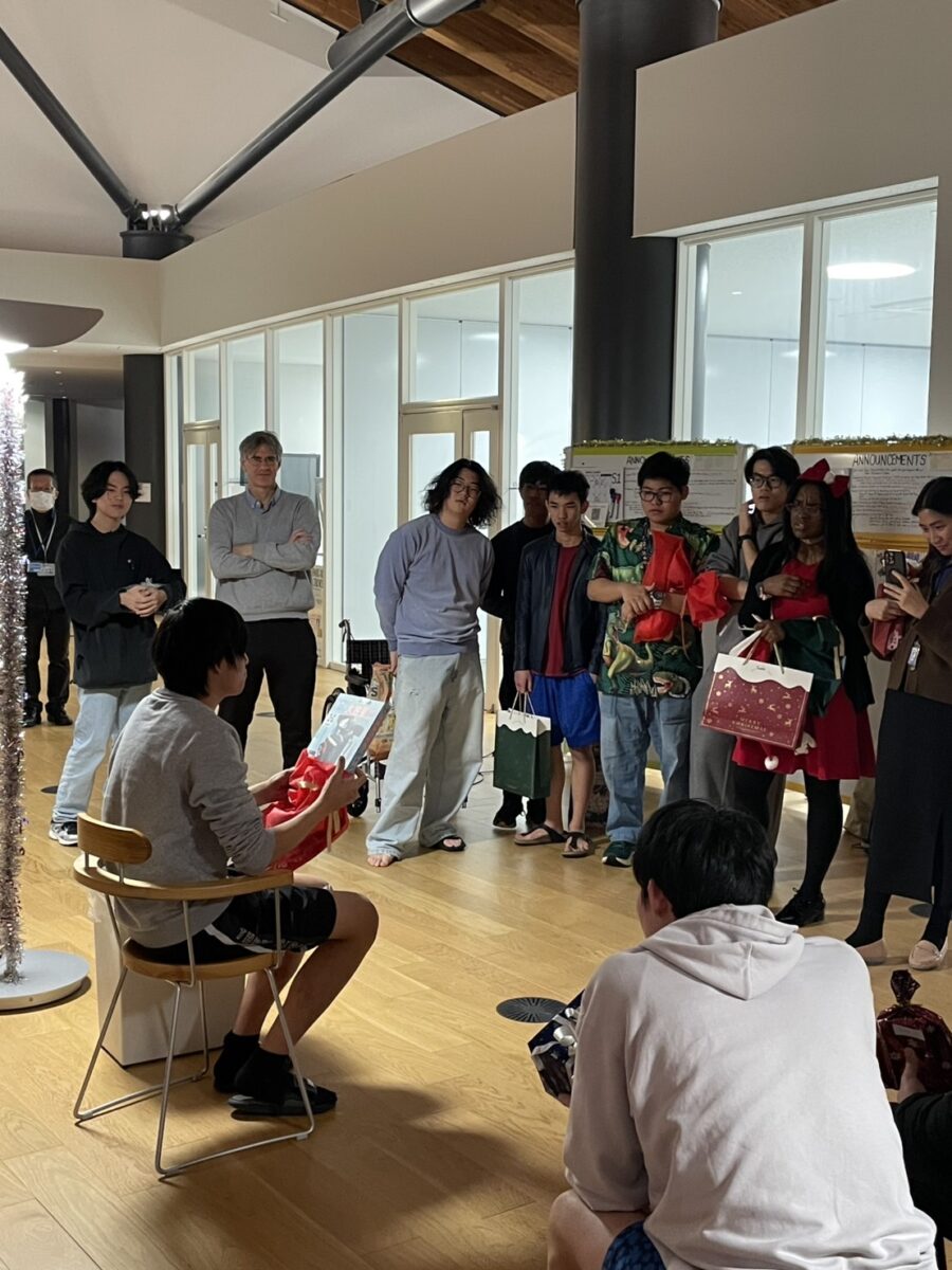 Then came the Secret Santa gift hunt. While the students were enjoying dinner, the Learning Mentors turned into sneaky elves—elves who assisted Santa Claus in making presents and pulling pranks—, gathered the gifts from under the Christmas tree, and hid them all around the Living Commons. When the students returned, the search began! There were cheers, laughter, and a few puzzled faces—mine included! I needed help finding my own gift!