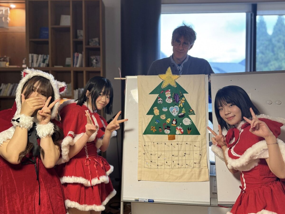 On Wednesday, December 3rd, 2025, I went to the Oguchi Community Centre to lead the annual English Café Christmas Party for local residents. This time, we had 17 children and 5 adults from the Yoshino, Oguchi, and Shiramine areas. With almost perfect timing, we had our first proper snowfall about an hour before the party began!