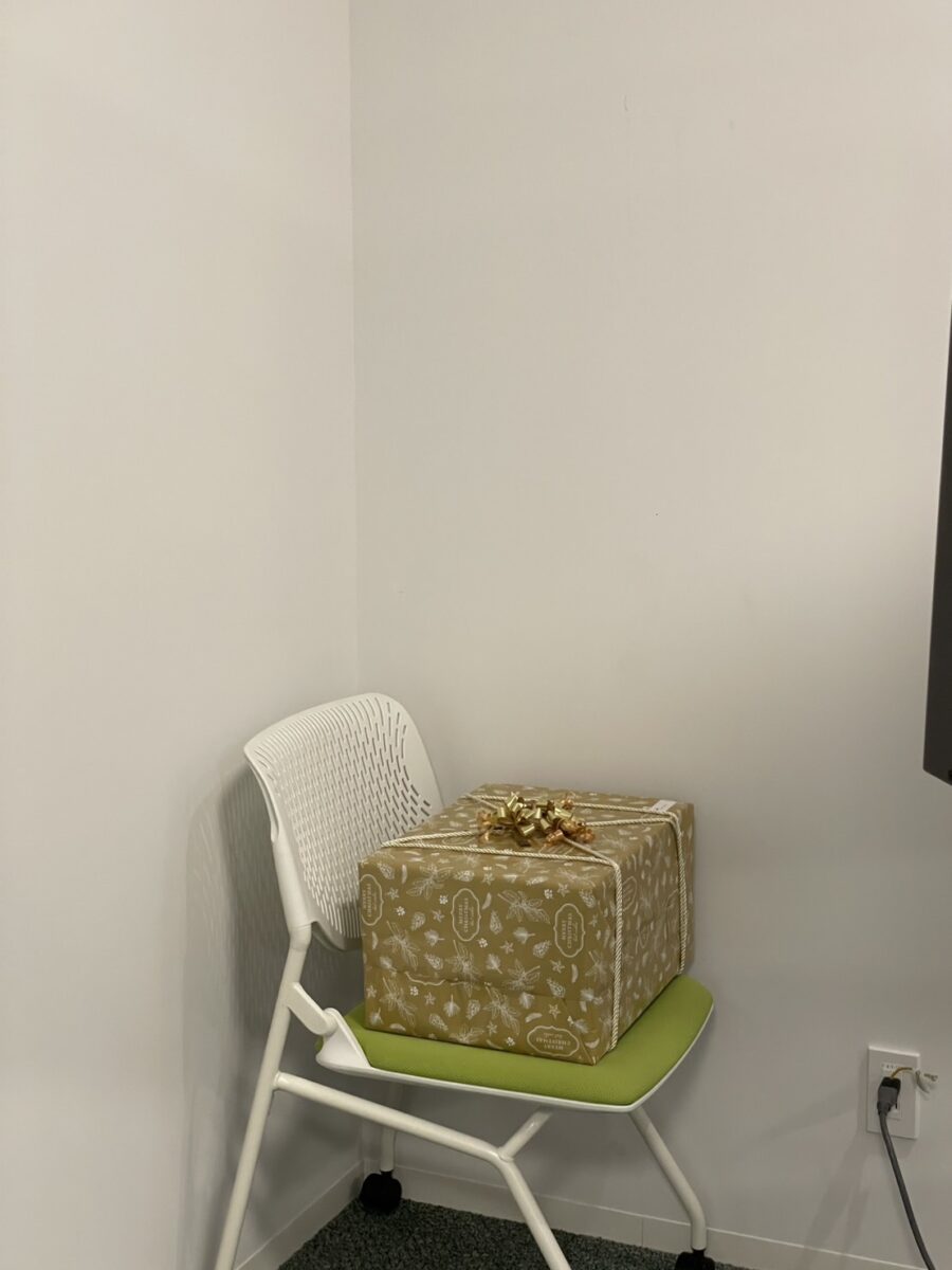 続いて行われたのが、「シークレットサンタのギフトハント」です。学生たちが夕食を楽しんでいる間に、ラーニングメンターたちが“Sneaky Elves”(サンタクロースの助手としてプレゼント作りを手伝ったり、いたずらを仕掛けたりするエルフ)に変身し、ツリーの下からプレゼントを集めてリビングコモンズのあちこちに隠しました。学生たちが戻ると、宝探しのようなプレゼント探しが始まり、歓声や笑い声があふれました。中には少し困った顔をしている人もいました。実は私自身も、自分のプレゼントを見つけるのに助けが必要でした!