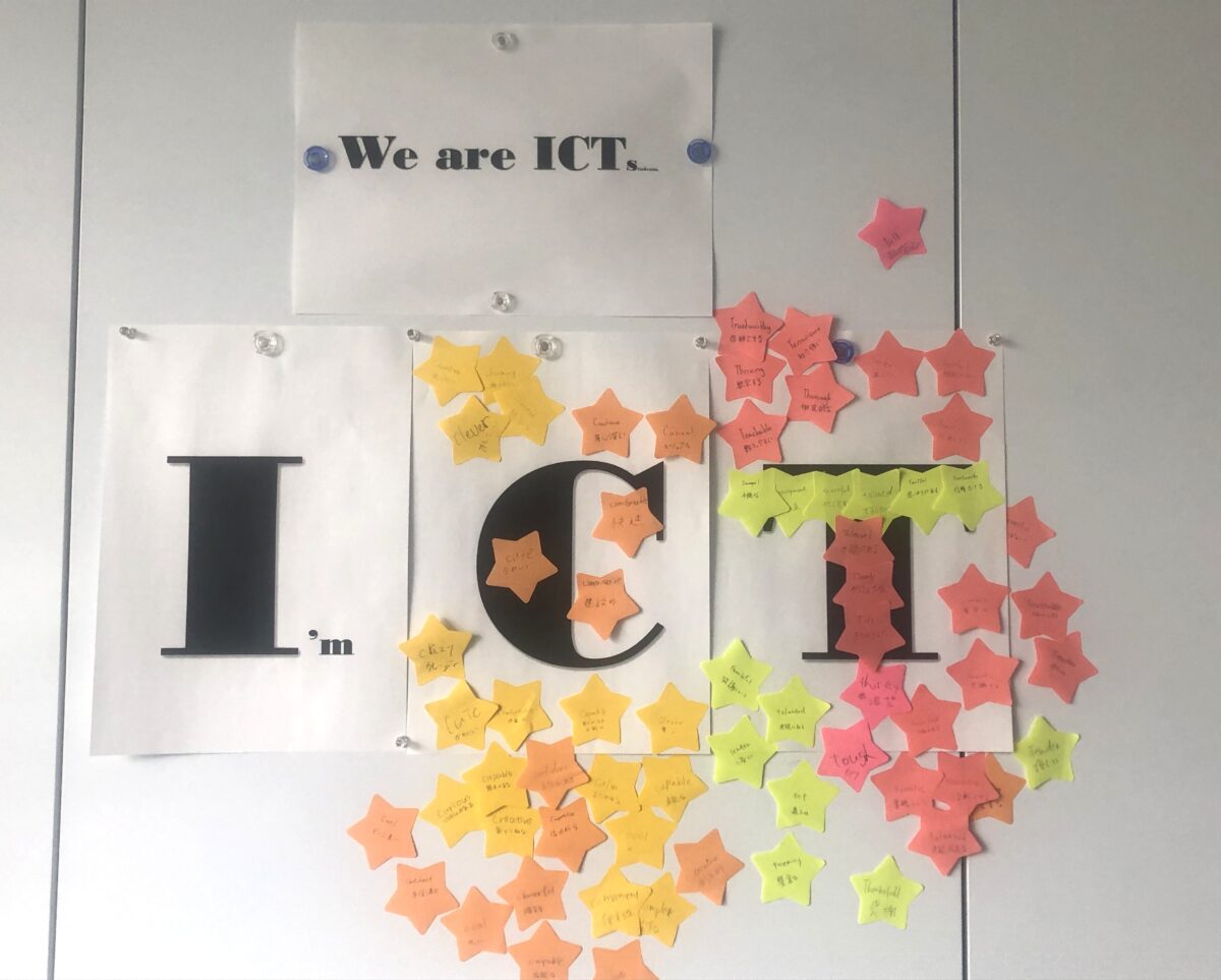 オリエンテーション期間中、私はこの考えを形にすることにしました。まず、「I・C・T」の大きな文字と「We are ICTs」というメッセージを掲示しました。そして学生たちに星形の付箋を配り、彼らには「学生」としてではなく、「成績」を気にするのでもない、「自分自身の物語の主人公としての自分」を考えてほしいと伝えました。