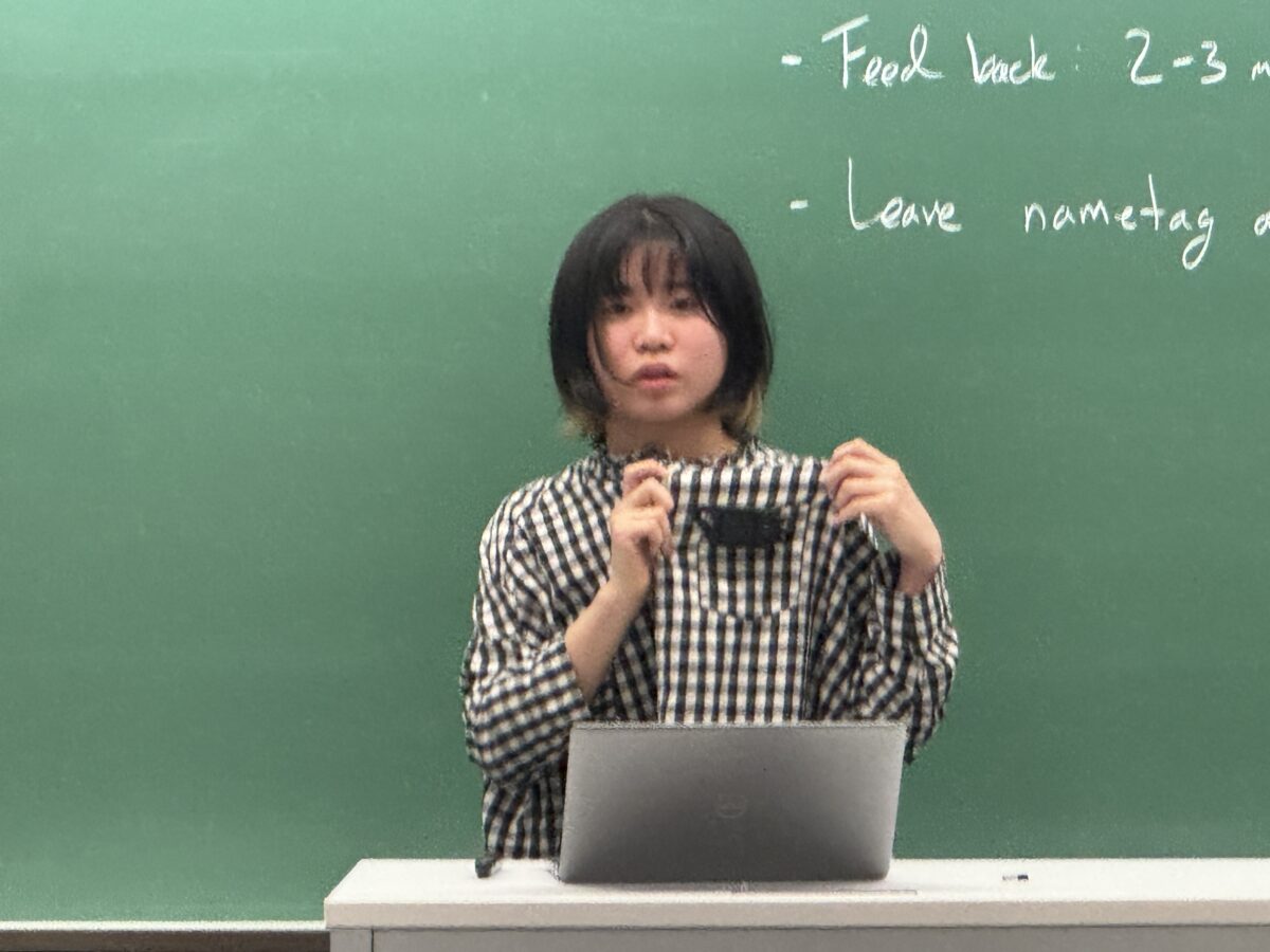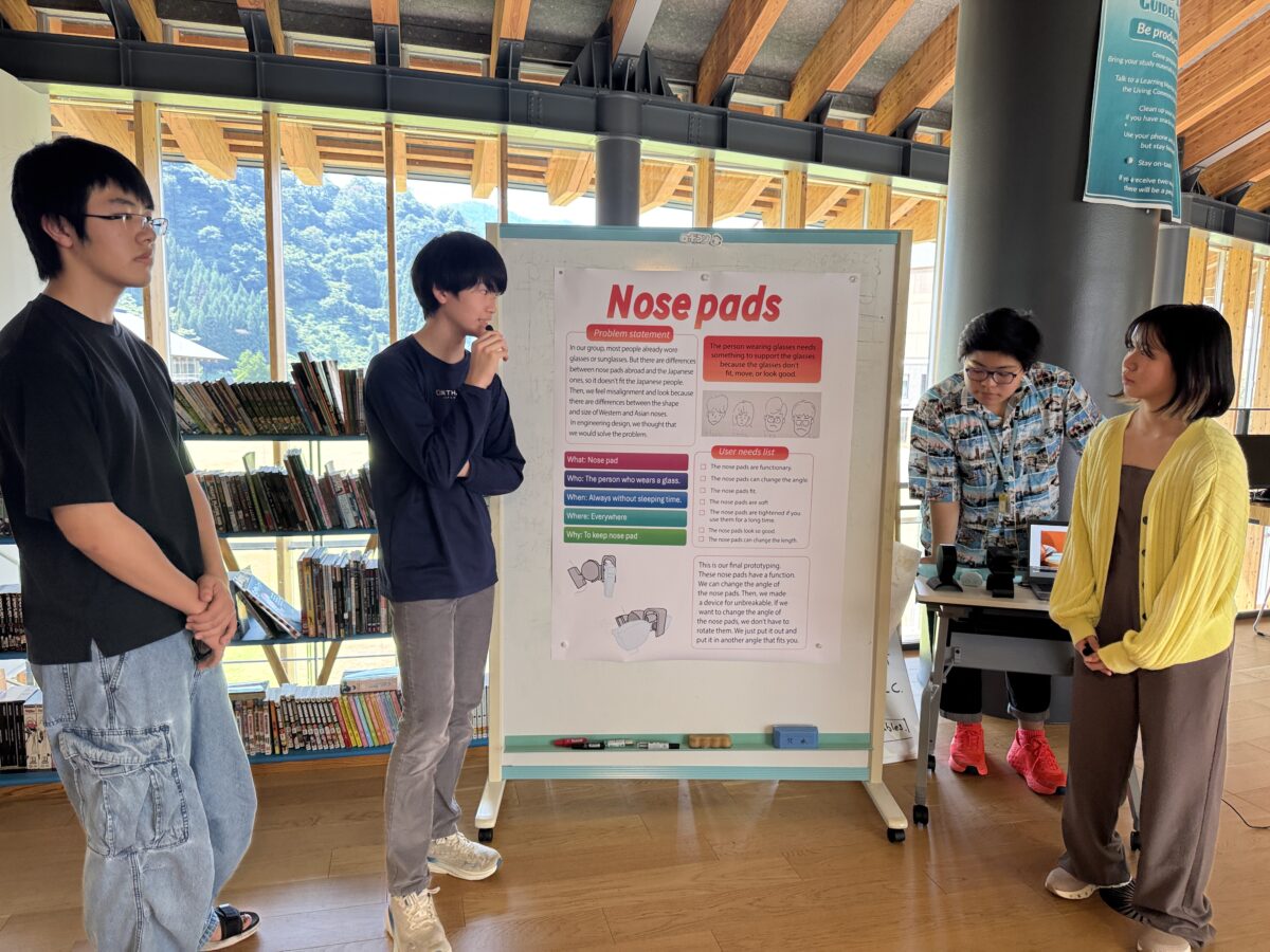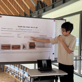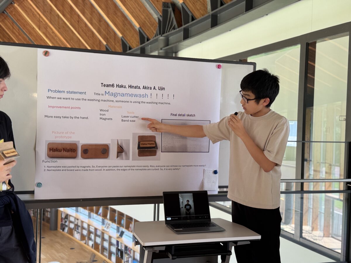 学生たちはアイデアの発想から始まり、プロトタイピング(試作品作り)を通じて、特徴と機能の関係性について学びました。プロジェクトの締めくくりには、英語でのプレゼンテーションを行い、クラスメートに自作のネームタグを紹介しました。