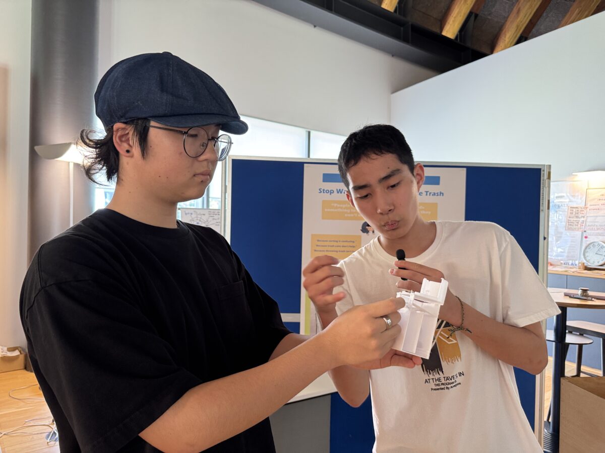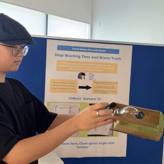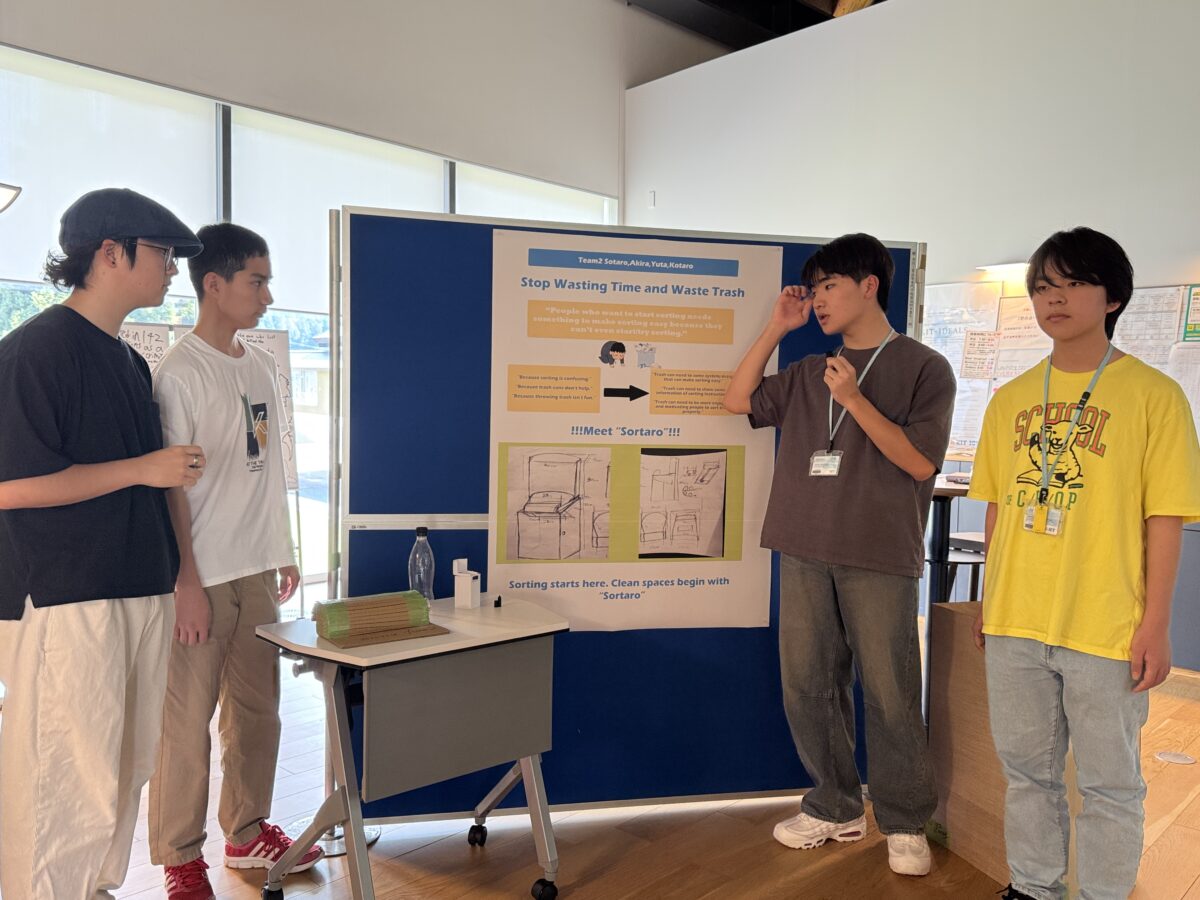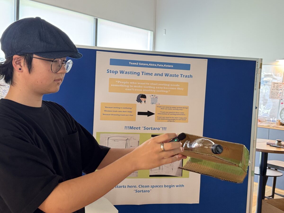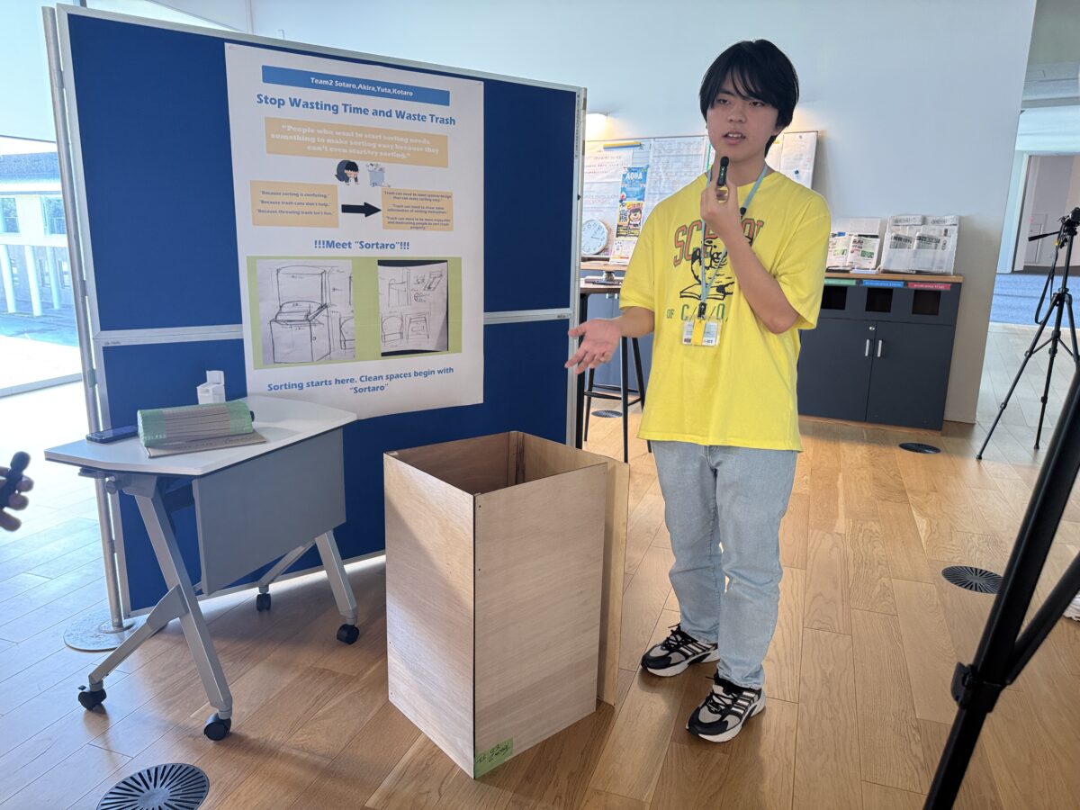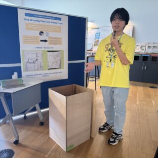 このグループは、ごみの分別が複雑で時間がかかるという問題に取り組みました。日本の分別システムに慣れていない人でも使いやすく、適切に分別できる一体型のごみ箱の設計を目指しました。