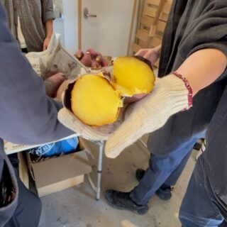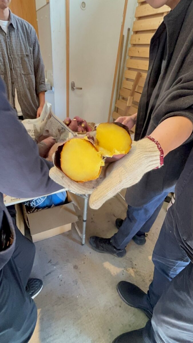 Kuru,ru.さんは壺焼きで焼き芋を作っていて、今回はそちらをお借りして高専紅はるかを壺焼きで販売しました。私たちも試食をしたのですが、同じ紅はるかでもよりねっとりしていて甘く、普通の焼き方と壺焼きの違いをとても感じました。